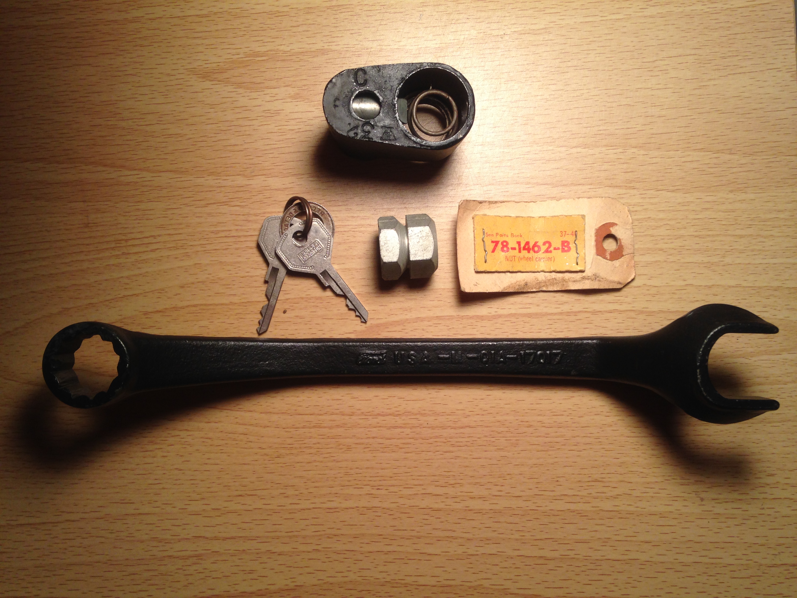 Mike you are correct I only received a lug wrench with my original tool kit, and have since purchased the lug wrench with the female end for the crank extension. here is a correct wrench no. 01A-17017 with one side having an open end. This is early 40, mid to late had both ends boxed and a different no. This is a picture of a N.O.S. {wheel carrier] nut it has fine threads it's double thick and has a groove in the center to activate the lock. I also got an air pump with the car and it has a wooden handle and is in mint condition. When you lay all this stuff in the trunk at a show people kind of freak out. Domenic