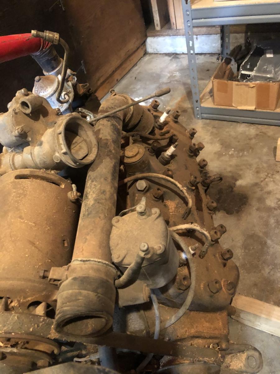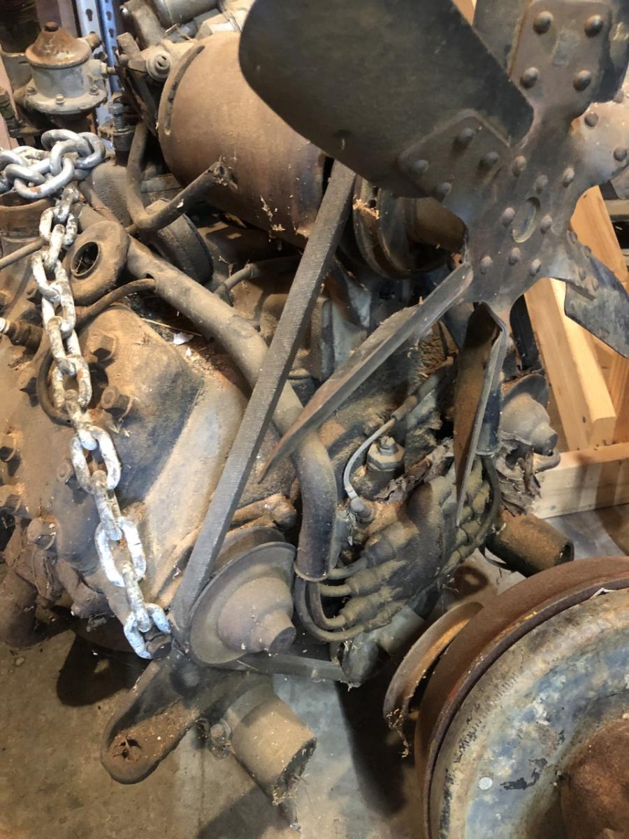 This engine has 59 AB heads. It came out of a 37 ton and a half, which means it was a replacement engine for the truck. It has a crab type distributor cap and the coil is on the drivers side front. The fan is mounted high, by the generator.