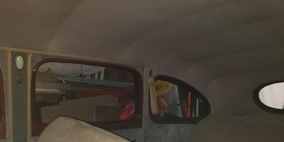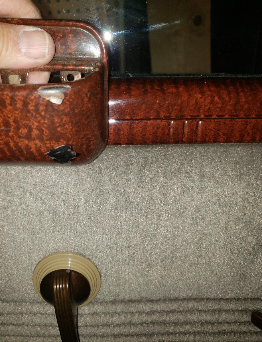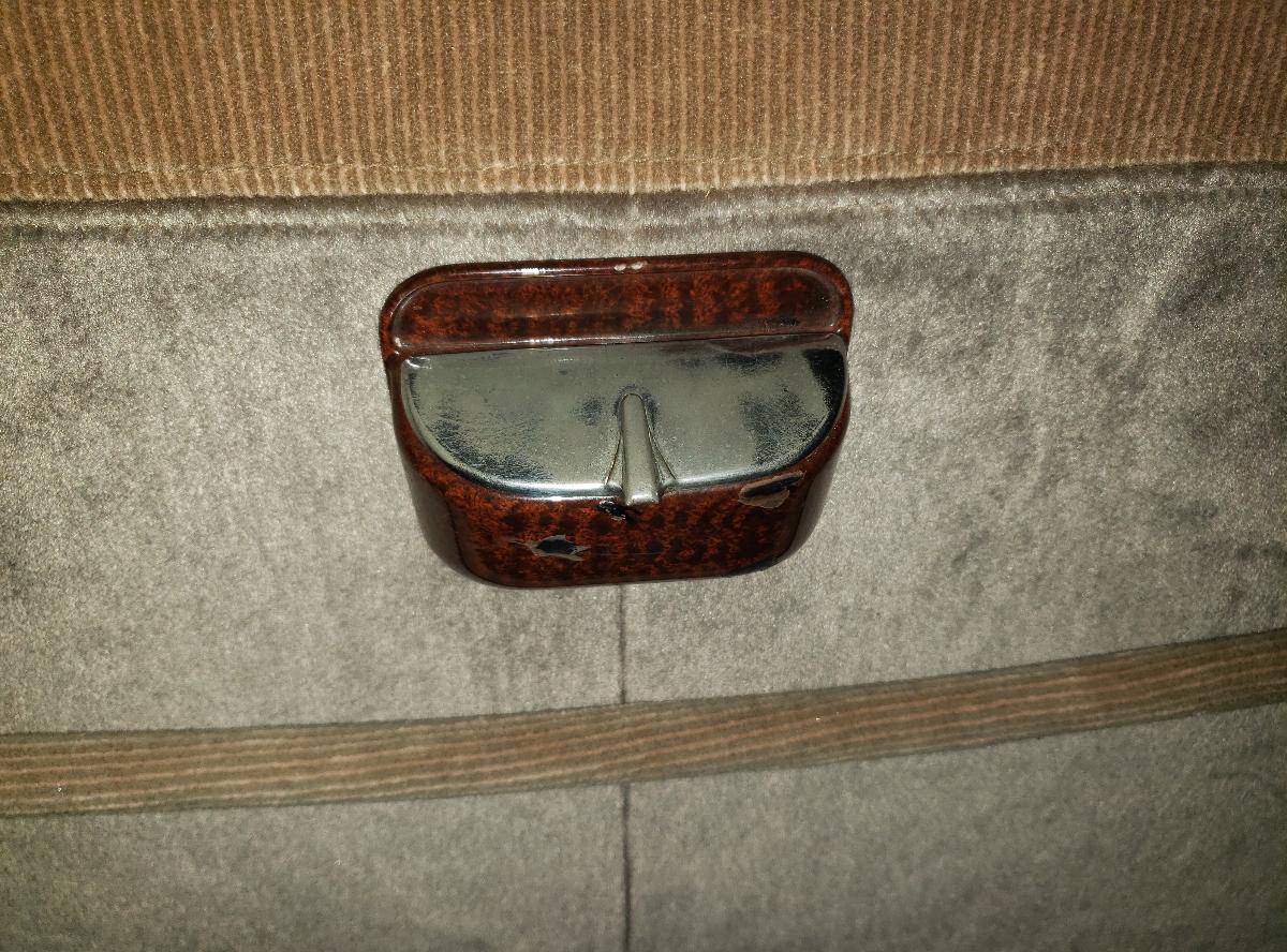 I have been doing other things, but today I went back to the Ford and installed the Robe Cord, Ash Tray, and Assist Straps. Also, I always wondered how close the wood-graining on the window garnish moldings of my 1940 Fordor Deluxe were-I had nothing to compare them to. Last week, a friend gave me an original 1940 Ford Deluxe Ashtray with most of the original woodgraining in tact. I think Bob Kennedy, (who did the woodgraining) did an excellent job!