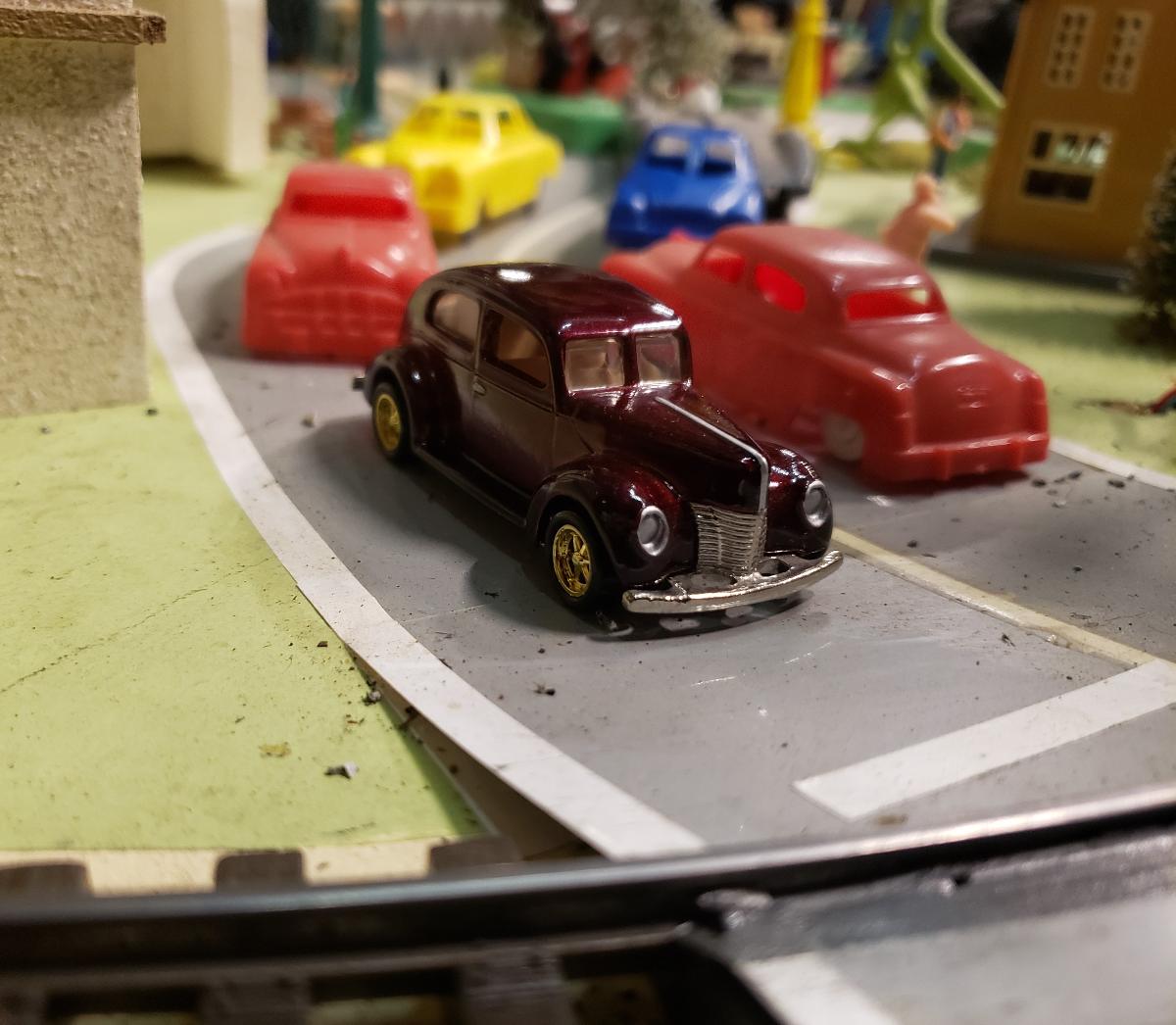 Waiting for the train... A good friend of mine gave me this Hot Wheels 1940 Ford Sedan-it immediately went on the train layout (built for me by my father for Christmas of 1960 and restored about exactly six years ago). Not a real Forty, but it means a lot to me! Although my full-sized one is a Fordor, this was a pretty cool gift (IMHO)!