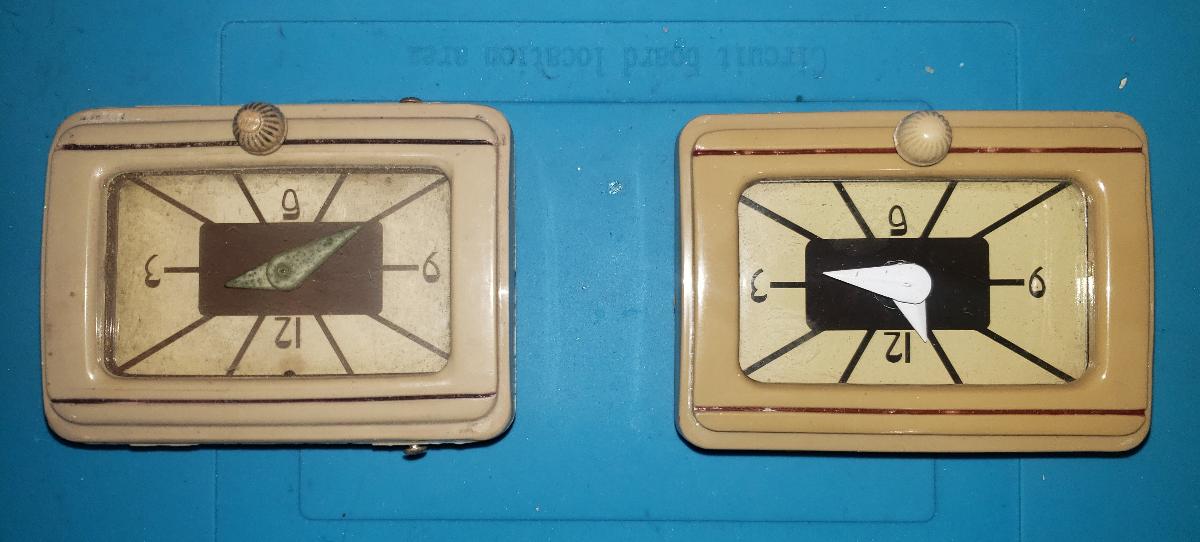 Still cleaning up little things on the 1940 Ford... For the first time the clock is actually running (and has been for almost a week)... (thank you to Britt Dietz for inspiring me to go after this project) I have had two clocks in the over the last 49 years: The original, 30 hour one, and one with a quartz mechanism that I purchased just over 20 years ago. The original one would run for a few hours, but never more than four or five (so much for the 30 hour thing, but the clock was made in 1940). When I found one that someone had modified with a quartz mechanism in one of the vintage Ford parts stores, I thought this would be a permanent fix, but it stopped and started about like the original one did. I finally took the quartz one apart on New Year's Even and examined it. Someone did a very professional job of cutting the back of the case for the new works, but the setting wheel could hang up on the back of the case and the hands were binding against the glass in the front. They had also neglected to clean the rust bumps from the back of the case and painted it (in an incorrect color). I took it apart, sanded and re-painted the back (hopefully the right color), fixed the other two issues and it has been running for a week now. A little thing, but a source of minor annoyance for a very long time. Photos below: Quartz and original clocks front, edge, and back: