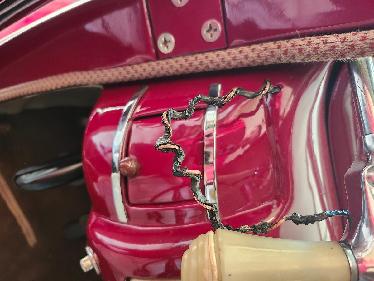 I just was going to take my 40 Tudor for a ride. I hooked up the battery and when I started it the spotlight started smoking. I immediately unhooked the battery. The wire is melted all of the way to about 4 inches from where it connects to the ignition switch. The car is all stock 6v positive ground. The wire harness is a cloth covered harness that has been recently replaced. I almost lost an old car about 40 years ago. I only have the battery connected while driving. I carry a wrench in my pocket while driving for the battery. I removed the wire from the switch for the spotlight . I'm a little nervous to try to start it.