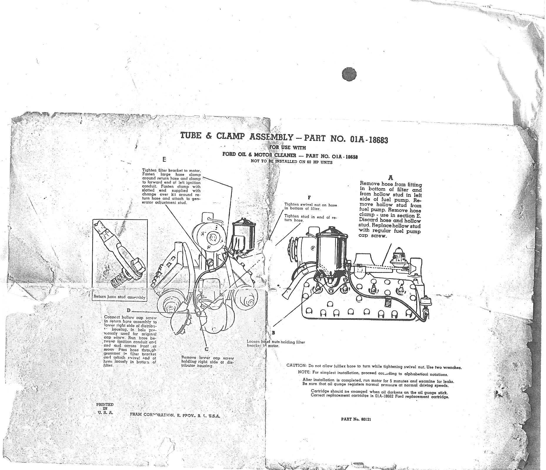 Mr. Lincoln, the return line that goes to the distributer bolt must be at least 24" in length in order to work. I have 2 NOS replacement hoses that are this length. The replacement P/N is 01A-6718 and the one that came in a box was made sometime after Ford changed to the FoMoCo logo for parts. The one that came in the Fram kit was 25". The 2/20/40 parts catalog was published before the change over around the May 1940 and probably refers to the hose that connected to the fuel pump stand. Tom