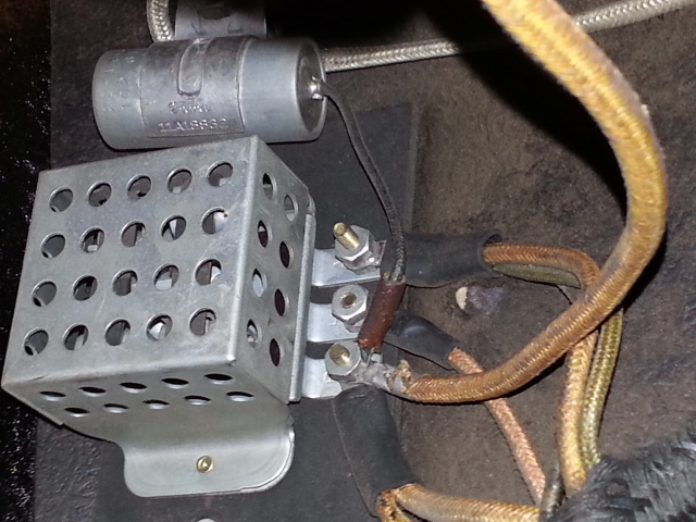 Alan clearly must not've had his coffee yet. The battery disconnect is great advice, not only for safety's sake but also piece of mind. Just curious TomO - why your suggestion to additionally remove the clock fuse in addition to disconnecting the battery? Know this is not the focus of your question Rickauf and only a tangent but feel the need to weigh in on something here. While I routinely disconnect the battery on my '47 after most all drives, or at minimum when the car is going to sit for more than 3-4 days, I have tested on several occasions the notion that our properly-running electro-mechanical clocks can run a 6V pos-ground Optima (in original-style case) battery down by leaving everything connected for 2-3 months of idled downtime without cranking the engine. Have never experienced a dead battery or even one that showed even the slightest deflection of the ammeter for additional charging when cranking and driving the car for the first time after that period, or a battery that displayed less that 6.2V when measured with my Fluke after this period - From my limited experience and perhaps non-scientific tests here, it occurs to me that while disconnecting the battery is certainly safety and peace of mind appropriate, to do so to simply prevent the battery from discharging will not address the root cause of any potential problem and additional work should be done to ID the source of ANY drain. I say this because... When bringing the '47 back to life I routinely had a battery drain problem that, while the car would start and run fine while the battery had adequate charge, would discharge the battery within 4-5 days if not disconnected. I found it hard to accept the little shot of juice the clock required every 4-5 minutes to rewind could possibly cause this and took days looking for the source until I quite literally stumbled across the problem. The terminal on the wire from the under-dash (radio) condenser to the ballast resistor (the condenser is mounted on the 'right' side of the resistor block under the dash and the wire for it crosses over the other two connections to its left and connects to the far left of the block) was slightly bent toward the front of the car and was making adequate connection through the then 66+ year-old original terminal insulations to drain the battery (see attached pic). This 'short' was not obviously visible to the eye and was found while under the dash with the Fluke sleuthing for the source of the drain and I almost burned myself when inadvertently touching the terminal with the back of my hand - it was hot as s#&t! This means it was like this while driving the car as well - an obvious fire hazard that could have been catastrophic! My recommendation is everyone reading this to do as stated above regarding the battery disconnect and be absolutely diligent and relentless in finding the source of ANY drain before driving any car much distance, if any distance at all. Again, from my experience, these batteries should not drain down when connected and the car idled within even 2-3 months. I perceive they will go even longer - for a year? hmmm...don't know or have the time and patience to perform that long an in-practice test. Regardless - FIND IT - FIX IT - AND DON'T BANDAID A DRAIN! You and your car will be rewarded - and protected - for your efforts. Fwiw - Steve