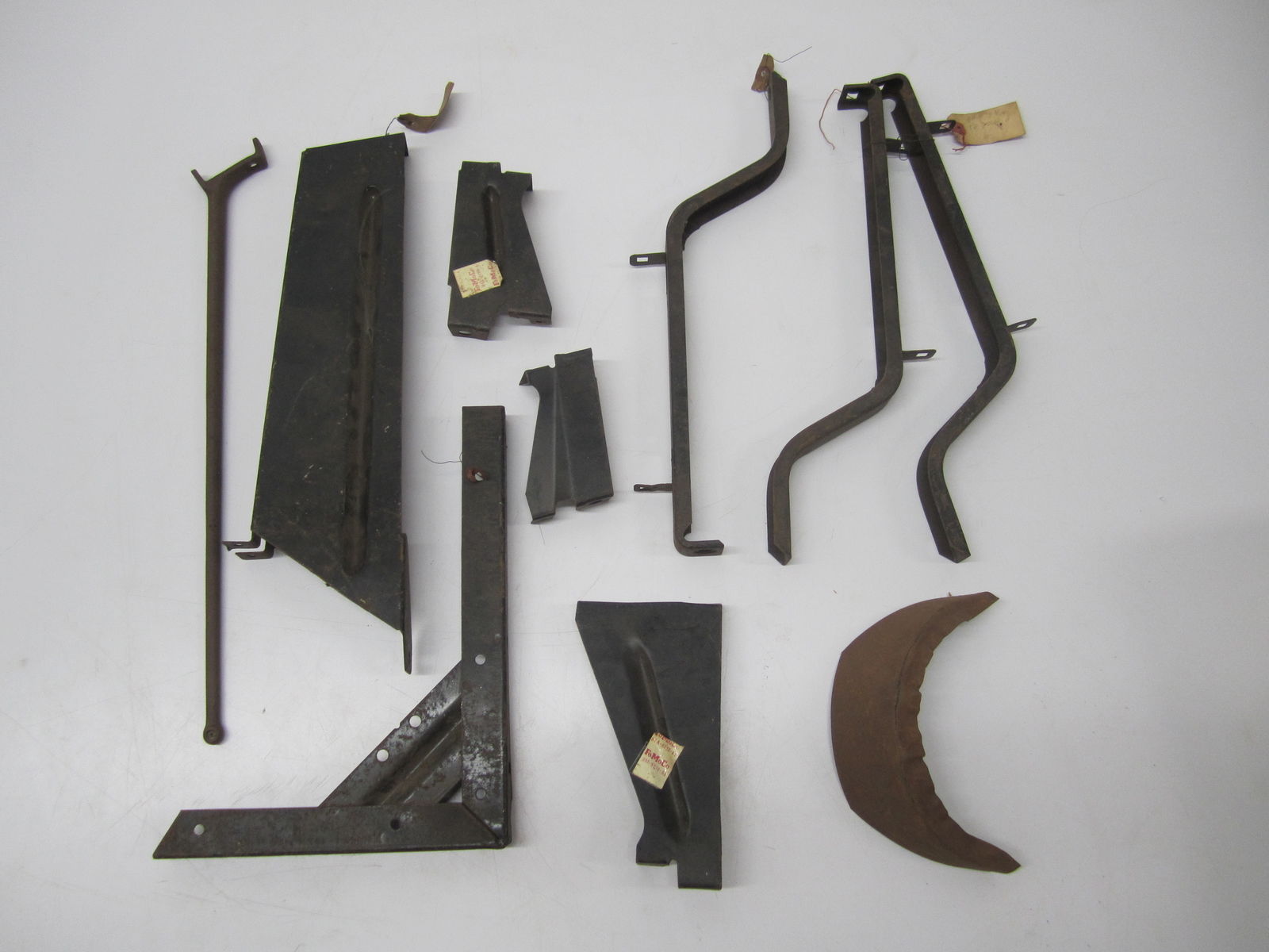 The long item on the left is a rear view mirror bracket which fits on the upper door hinge. I have no idea on the rest.