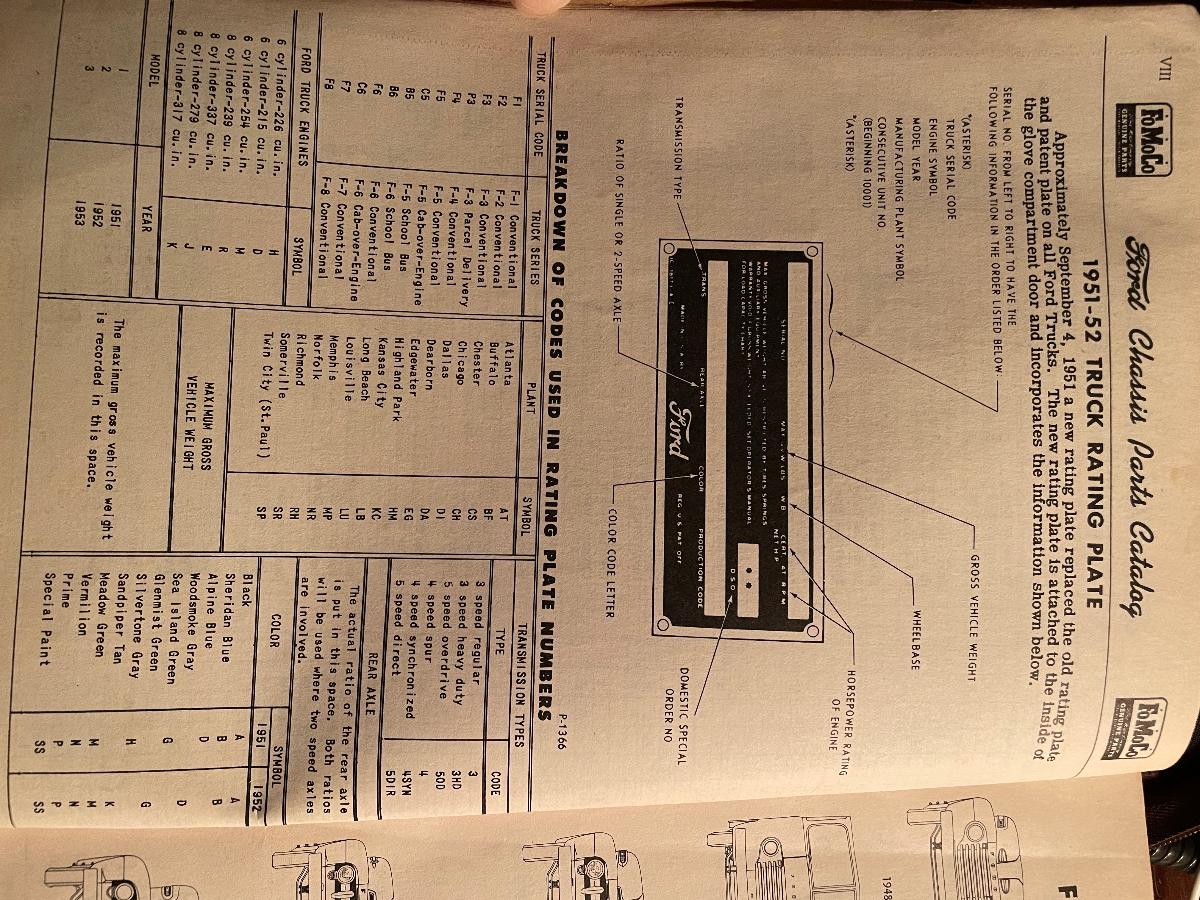 This should tell you most of what you are looking for. F1R2KC13907 Sorry photo came out lopsided. F1 Conventional 1/2 ton, R=8 cylinder 239 cu.in., 2= 1952, KC= Kansas City Plant, and I believe the rest of the numbers are just factory internal production codes, but I could be incorrect about that. The rest of the info on your truck is on the glovebox VIN plate which was a first that 52 trucks had. The color code, rear axle ratio are listed separately. I've found a lot of the color codes are incorrect for whatever reason. 52 trucks also did not have a firewall data plate but did have the holes for the data plates. A lot of restorations you'll find including mine, include the available reproduction data plates which look cool, but technically aren't correct. P.S. Just learned on another forum, FTE, that the numbers on the VIN that follow the plant code are consecutive unit numbers that started at 10,001 at each plant. I assume that is for any and all trucks only. There is another number located on your glove box VIN tag called a production number that will have a date code at the beginning of the number. Month Codes should be correct for both years. But Im not clear as some people said there was a 2nd year date code that was lettered starting beyond M. 1951/52 A= Jan B= Feb C= Mar D= Apr E= May F= Jun G= July H= Aug J= Sept K= Oct L= Nov M= Dec