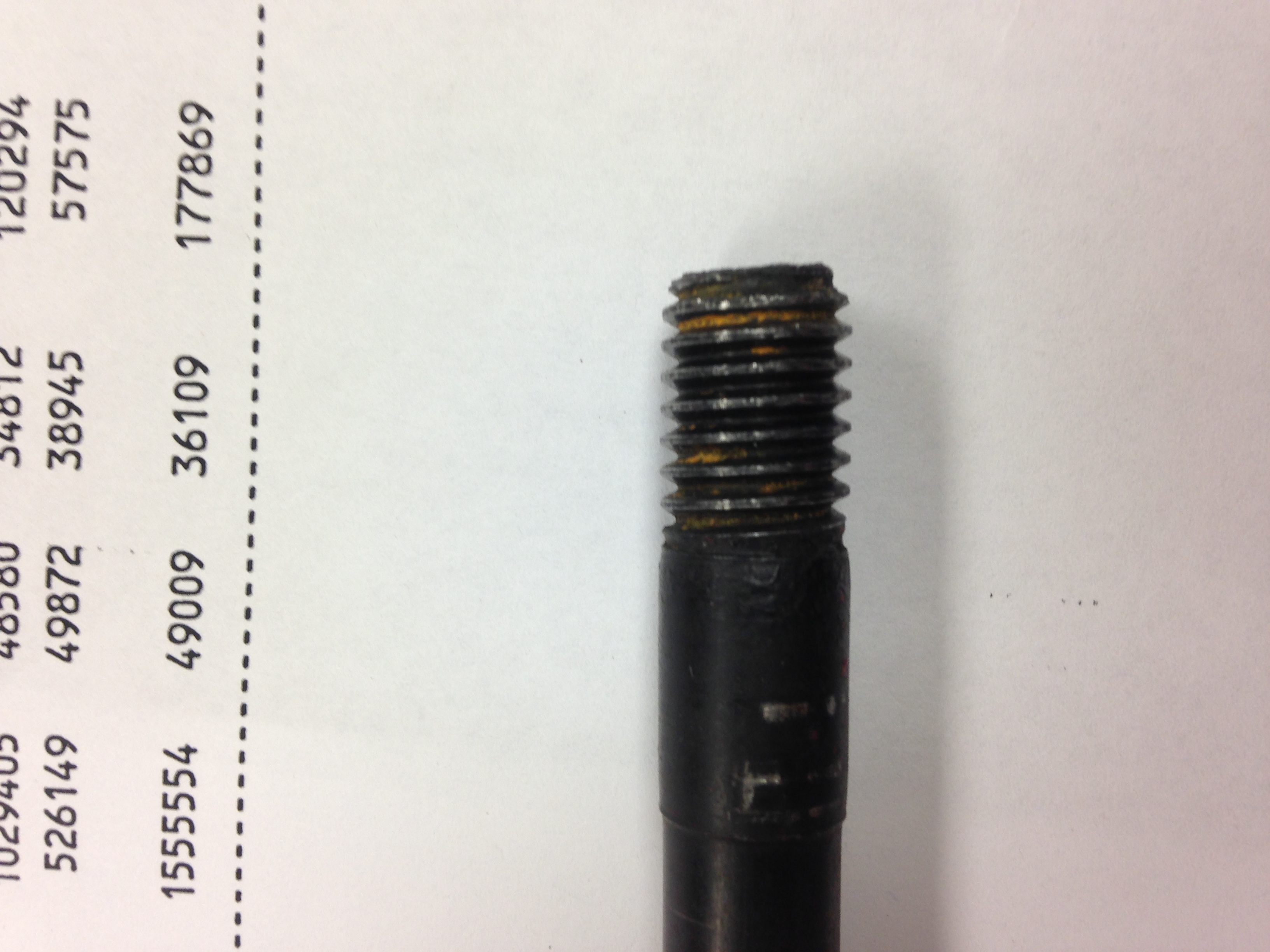Thanks for all the advice it is much appreciated! Looks like a heli- coil's in our future. I'm starting to wonder if it might have broke off as the end of the stud doesn't look machined. 3 5/8' long here's a pic. By the way assuming this stud should be replaced who's the preferred vendor?