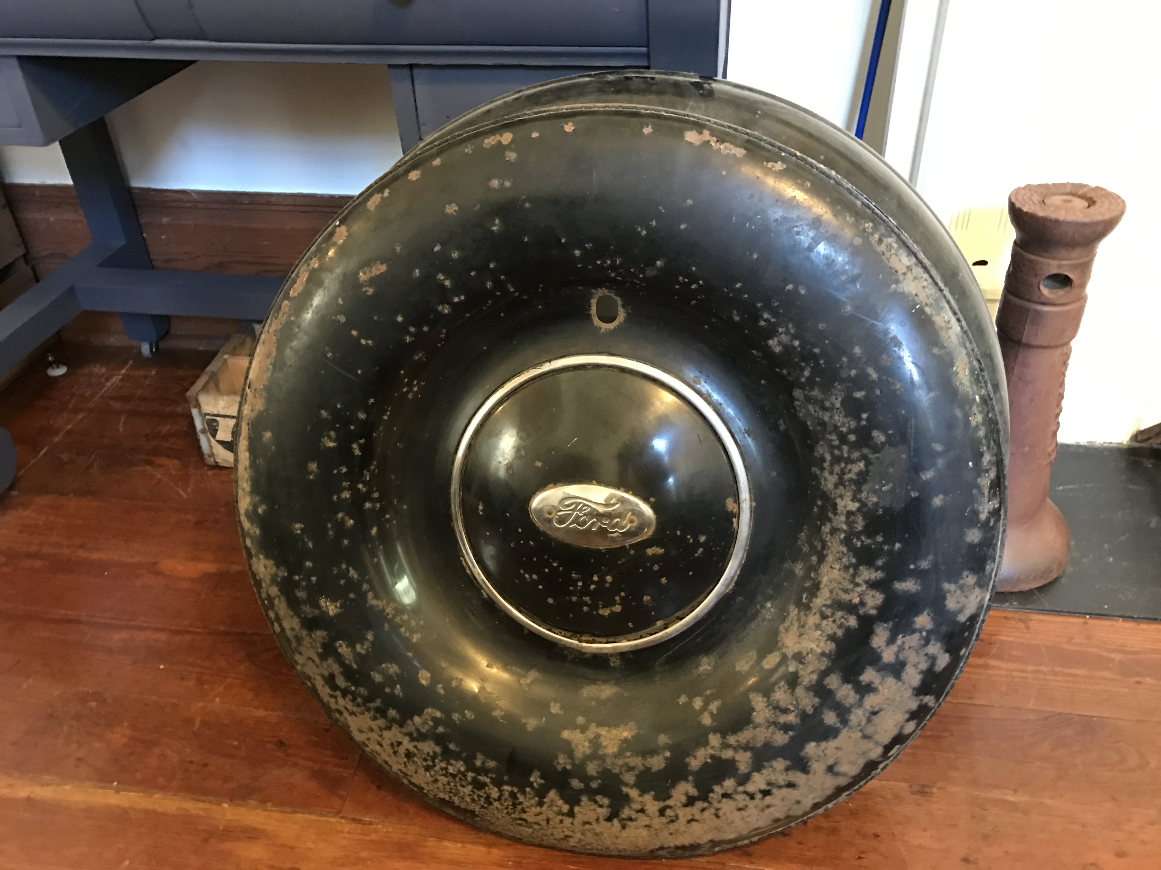 Also, I am curious what this spare cover and trim might be worth. I was told by a supposed expert that it is more rare than most b/c of the shape of the emblem portion. As you can see this cover comes with the original trim. The rust you see is only surface rust and it appears to be original paint.