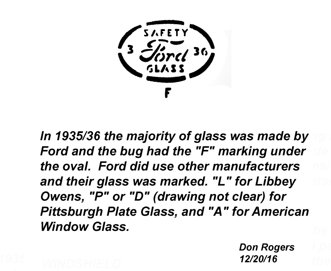 In the book offered by the V-8 Club for '41 thru '48 Fords gives an explanation about "Glass Bugs". The "date code" are the letters to the left and right of the Ford Script. The letter to the left is the month, A= January, B= February etc. The letters to the right is the year. For example DF= 46. The "Bugs" for my '46 Ford are marked I-DF or September of '46. That being said the article also goes on to state that prior to January, 1941 the date logo was in numerals, so your car being a '36, should be in numerals, if I read the article correctly. Can anyone that has a '36 verify this?