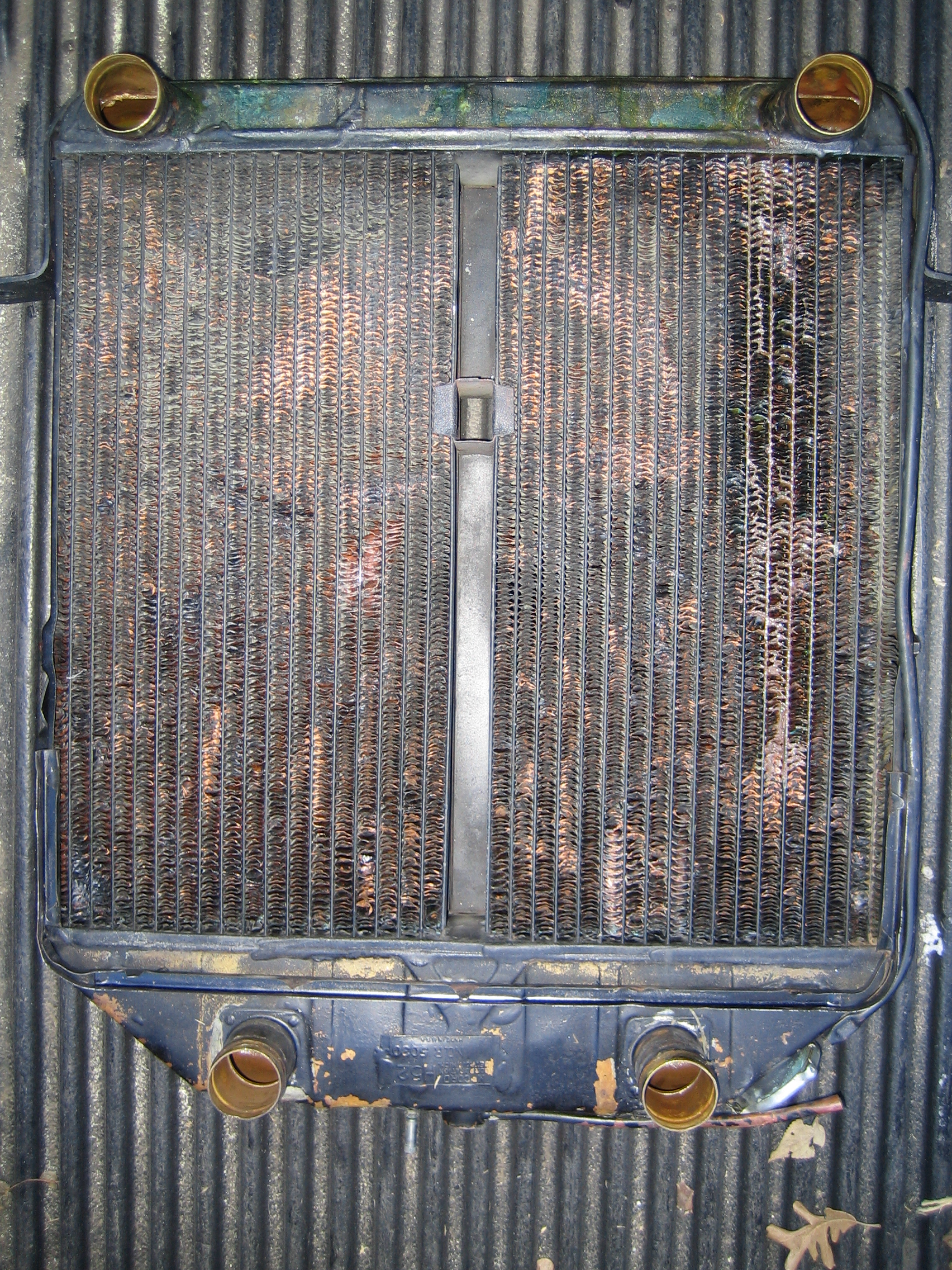 I agree with Alan in that this one has been re-cored at some point. It is not authentic. I have my radiators done locally for around $500 each. I take the tanks and brackets home, restore them and return to be installed to the new cores. Mike "Kube" Kubarth