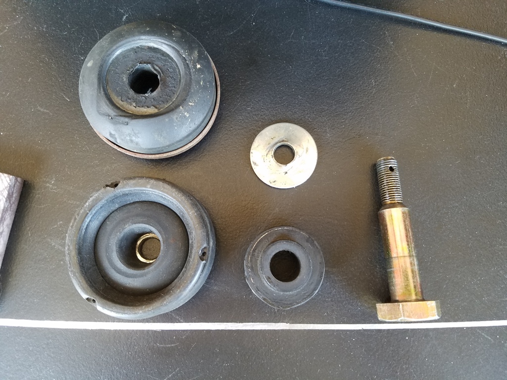 alanwoodieman - a pic of all the mount parts is below, I removed them in their entirety today. I am talking with the supplier now. Thinking is twofold here - they supplied me the wrong mount all those years ago even though the paperwork shows the correct part number. Note the underside of the top bushing displayed - I cannot recall if it was like this originally. None of the current sources, nor the original bushing, are 'inverted' like this and if they did in fact 'pic' the wrong part it likely has failed over the miles and reduced the overall height of the top bushing which consumed, as it failed, the bolt distance necessary to compress the bottom bushing. Secondly, the shoulder length on the 'new' bolt is clearly longer than the original and longer than anything anyone has in stock for the correct motor mounts for the '47.