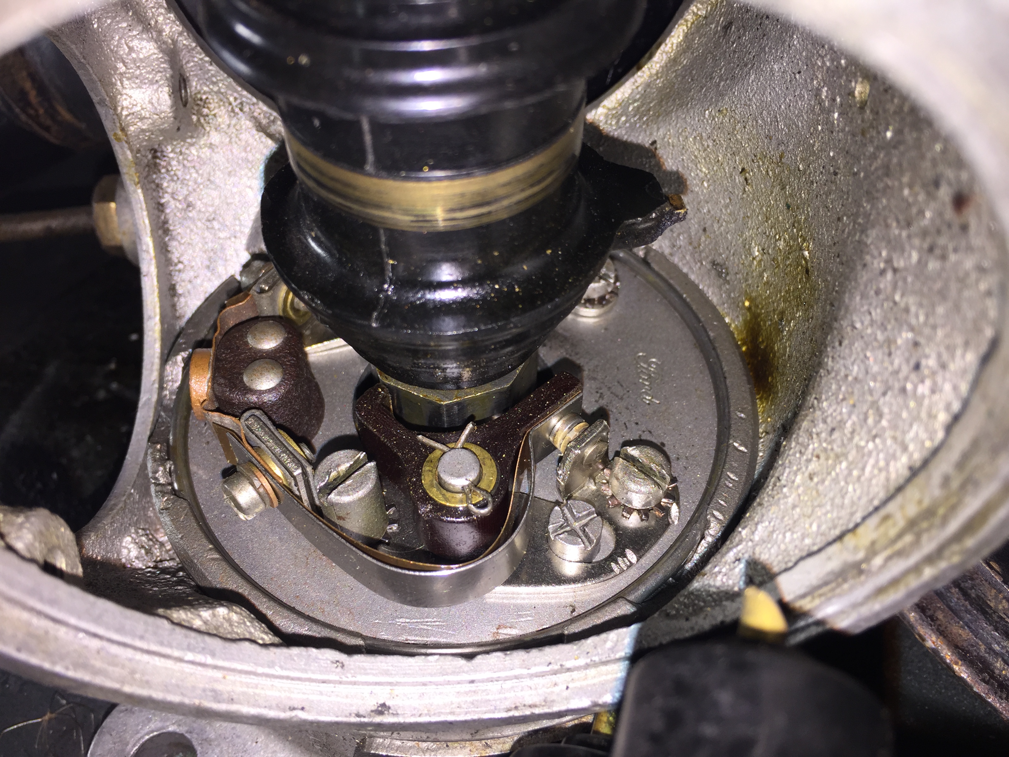 TomO Here's a good pic of the points on the passenger side of the distributor. You can see the gap. Everything looks fresh.