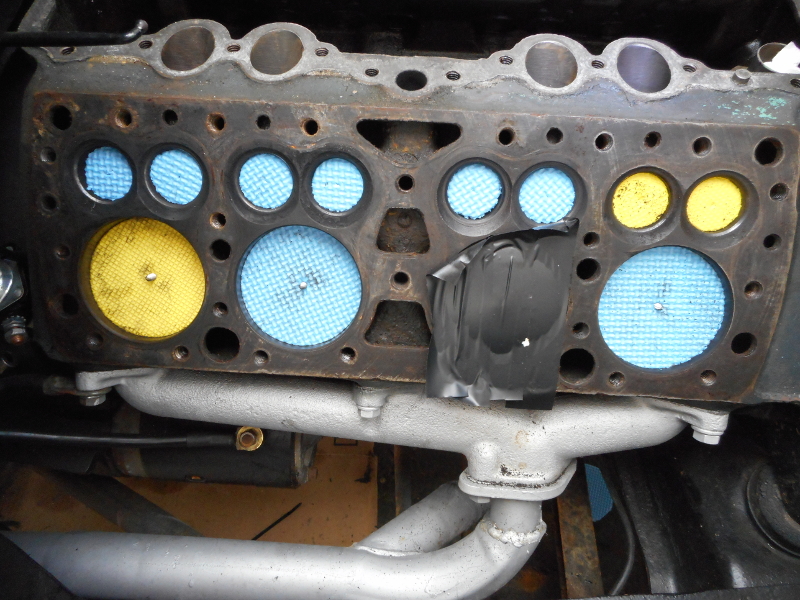 Thanks Tom, I'll look into the harnesses at Rhode Island. Just started the brakes and the first one I looked at has a bad leaking wheel cylinder so will need to take care of the whole braking system before wiring. I forgot to mention something I did to prevent dirt from getting into the piston bores when cleaning the block face. I bought the 1/2" thick Foam Garden Kneeling Pads you can find in the Dollar stores and cut some over sized plugs (using a compass) to seal up the valve and piston holes. It worked really good keeping out all the scr*pings and when done you just vacuum the debris and lift the plugs out (starting with the valves) and any residual debris gets pulled out with the plug. The holes stayed nice and clean. Hopefully you won't tell me the foam will eat the block but maybe it will help others in the same situation as me. Attached is a picture. Note that one piston was taped but I later just moved the pistons so all 4 cylinders could hold a plug. Charlie