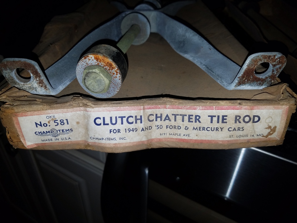 Steve Ah the clutch anti-chatter tie rod, AKA the slingshot. I have an earlier version on my 42 Ford. Not that it does any good. Certainly not a Ford authorized accessory. I'm surprised they were still peddling these in 1950 as the after 48 cars had a different drive train that should have corrected the problem. Ted