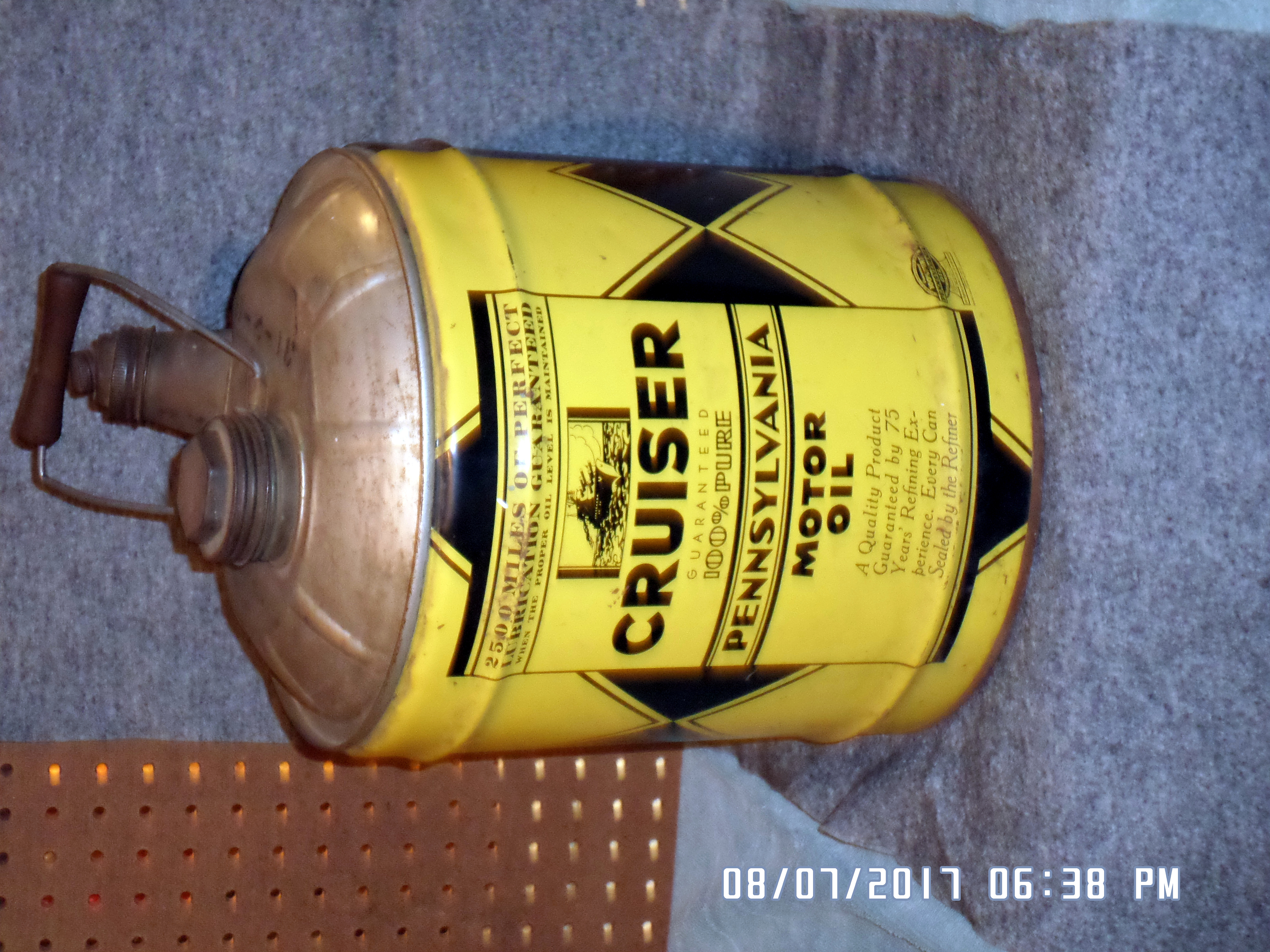 It has been a while since I logged in on this forum since my 1950 Ford was restored and usable. I have a strange item to address; i.e., The potential value of vintage oil cans; Are there really individuals who collect antique Oil Cans? I ask because I have an ancient 5-gallon oil can that was "old" back in the 1950's. It is a "CRUISER" 100% PURE PENNSYLVANIA MOTOR OIL. I thought I would ask this Ford Forum before I embark on learning to use "ebay" If there is any interest, I can try to send picture and discuss value to a would-be collector/buyer.