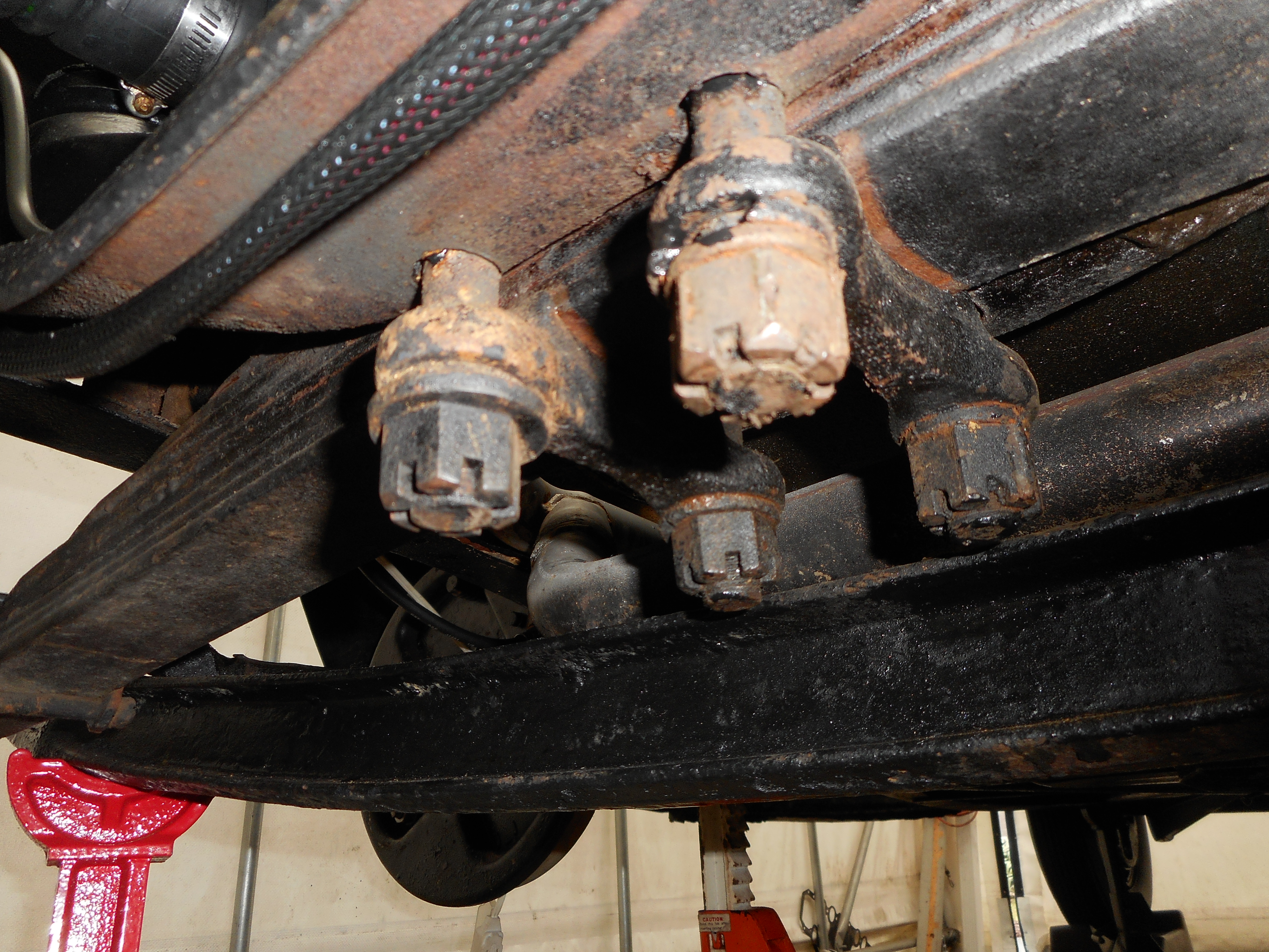 Update: While trying to install the Shock Absorbers I took a better look at the whole steering system and decided to replace the tie rod ends, drag link and king pins. While under the truck I started looking at the spring again and noticed the U-Bolt castle nuts did not have the cotter pins installed. Also one of the nuts was way lower on the bolt than the others. I used a ½” socket wrench and tried to move the low one and it was very easy to turn (I turned it at least one revolution to bring it flush to the bottom of the threads). Here’s my questions 1. What is the correct torque for the U-Bolt nuts? 2. Can they just be tightened to the correct torque and cotter pins installed? 3. If so, is it best to support the frame and let the axle drop or tighten them with the weight of the truck on the spring. I attached a picture of the U-Bolts if that helps, Thanks for your help once again.