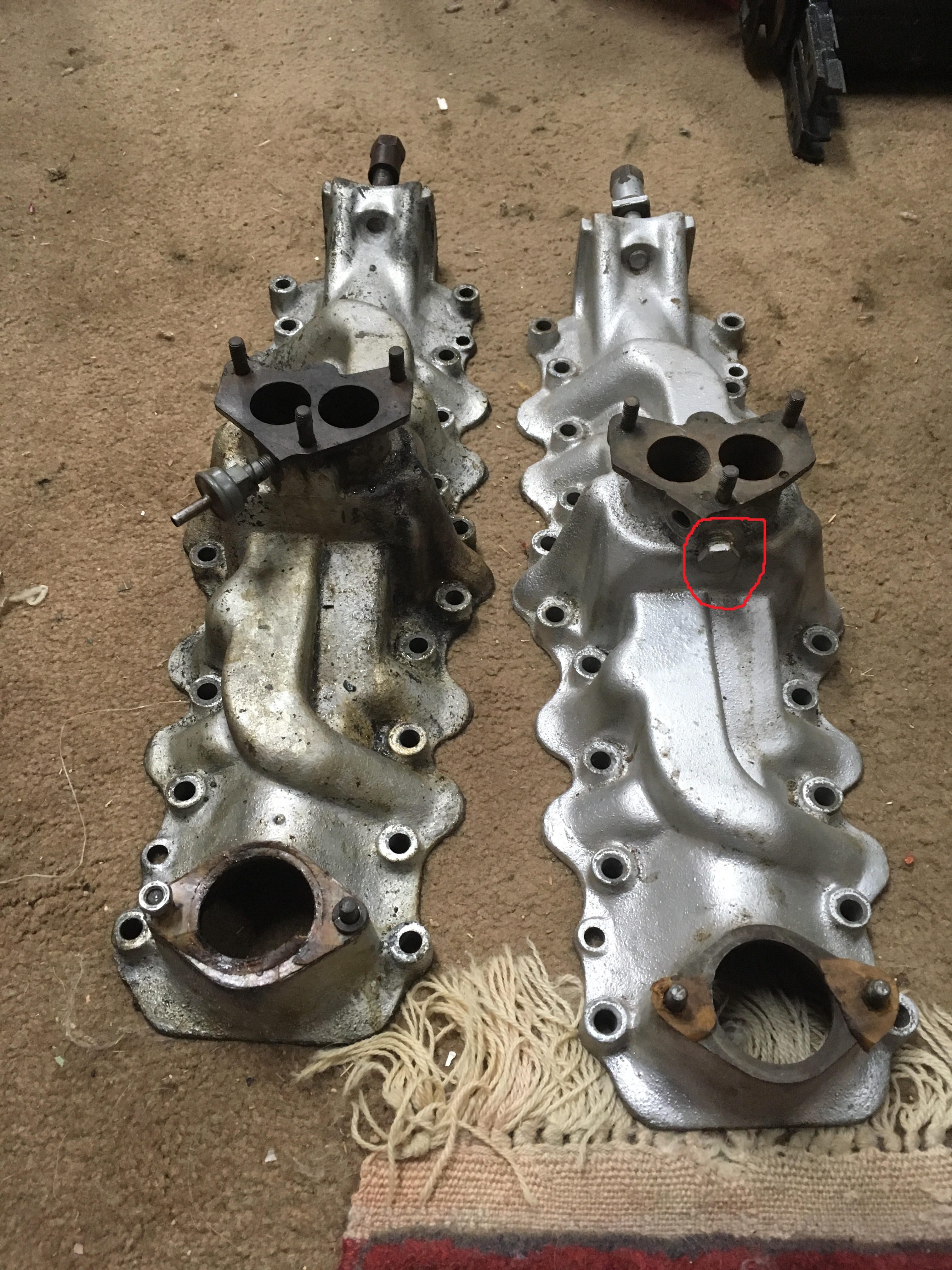1. See pic of intake manifolds. The one on the left was on the car. The one on the right was in a box of spare parts. Almost the same but the one has a bolt/plug just beneath the carb mount. What’s the diff? Which one more appropriate for my ’47 car? And should the intake be blasted and left bare, or painted? What color was stock?