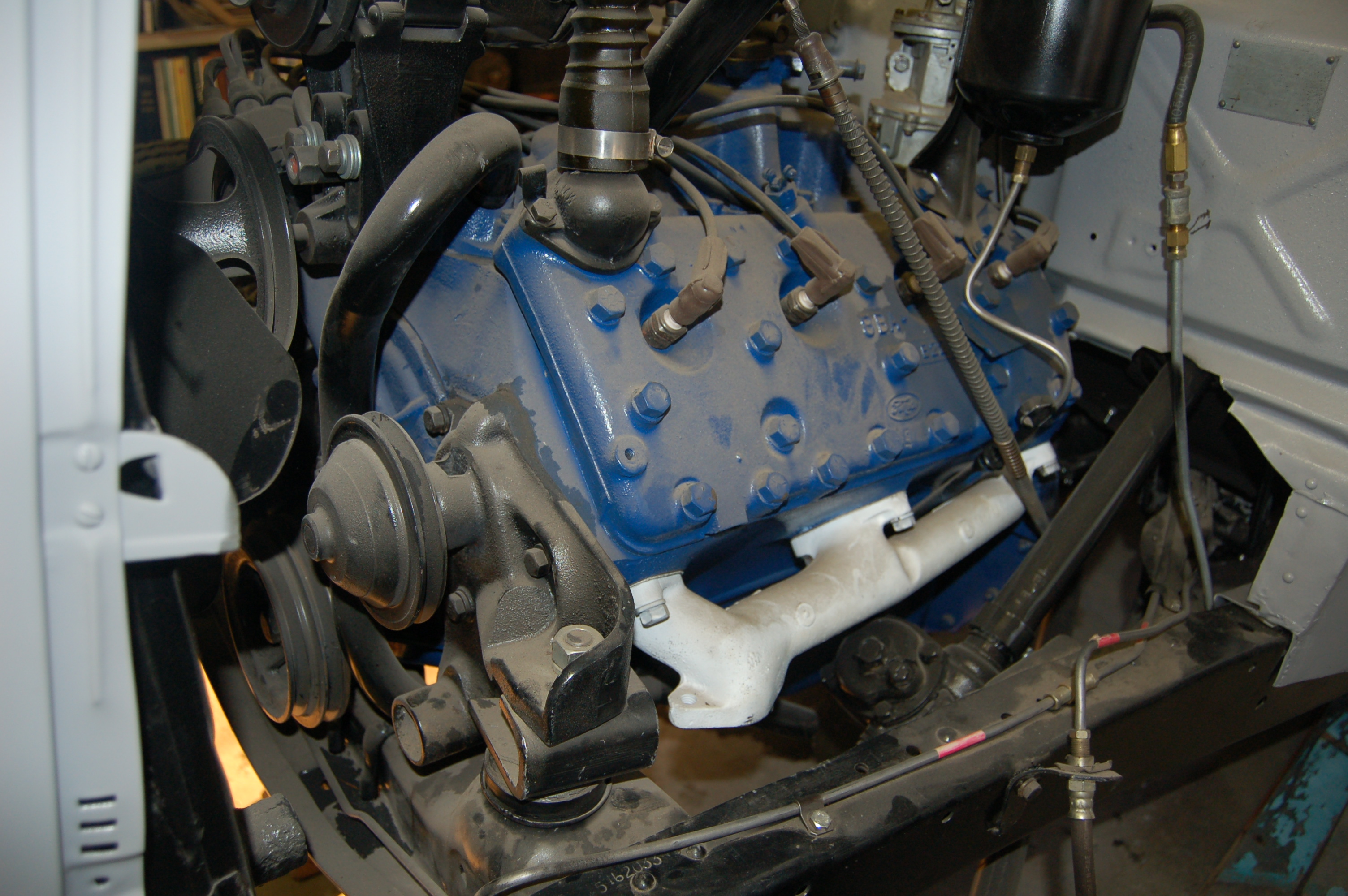 To reply to my earlier posting about an 8BA engine in an early Ford... The Merc/truck water pump mounts do not line up with the holes in the frame cross-member and the engine sits lower in the front, therefore being out of level. The '49-50 Merc spacer blocks raise the engine and the bolt holes in the spacer block are off-set, which allows for the stock EFV8 motor mount bolts to come straight up to the lower hole in the spacer, then an additional bolt is attached to the ear on the water pump. I think most guys try to force one bolt through the motor mount and the water-pump which would tend to pull the engine forward. Since there is not provision on an 8BA type of engine for the stabilizer rods, there is nothing to restrain the engine to the rear, unless a fixture is made to attach the original rods to the engine.. I think most guys just omit them. I have attach a pix of a stock application of 8CM engine in a '49-50 Merc.
