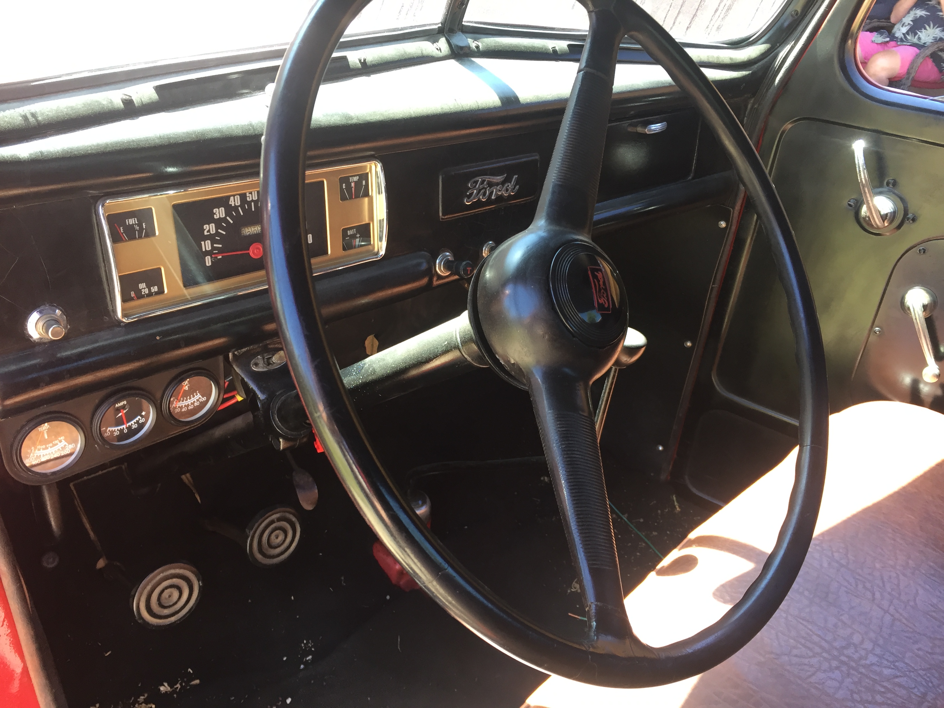 the truck pictured is a 41, wide hood "nose" trim , hood" wiskers" are cast not SS. Does the dash have a raised portion in the middle that has an attached Ford script or does it have an attached emblem like on the hood? Tail gate has no V8 emblem, just has a ford script. Howard Townes book is great for help in identifying differences in 40 and 41 pick ups