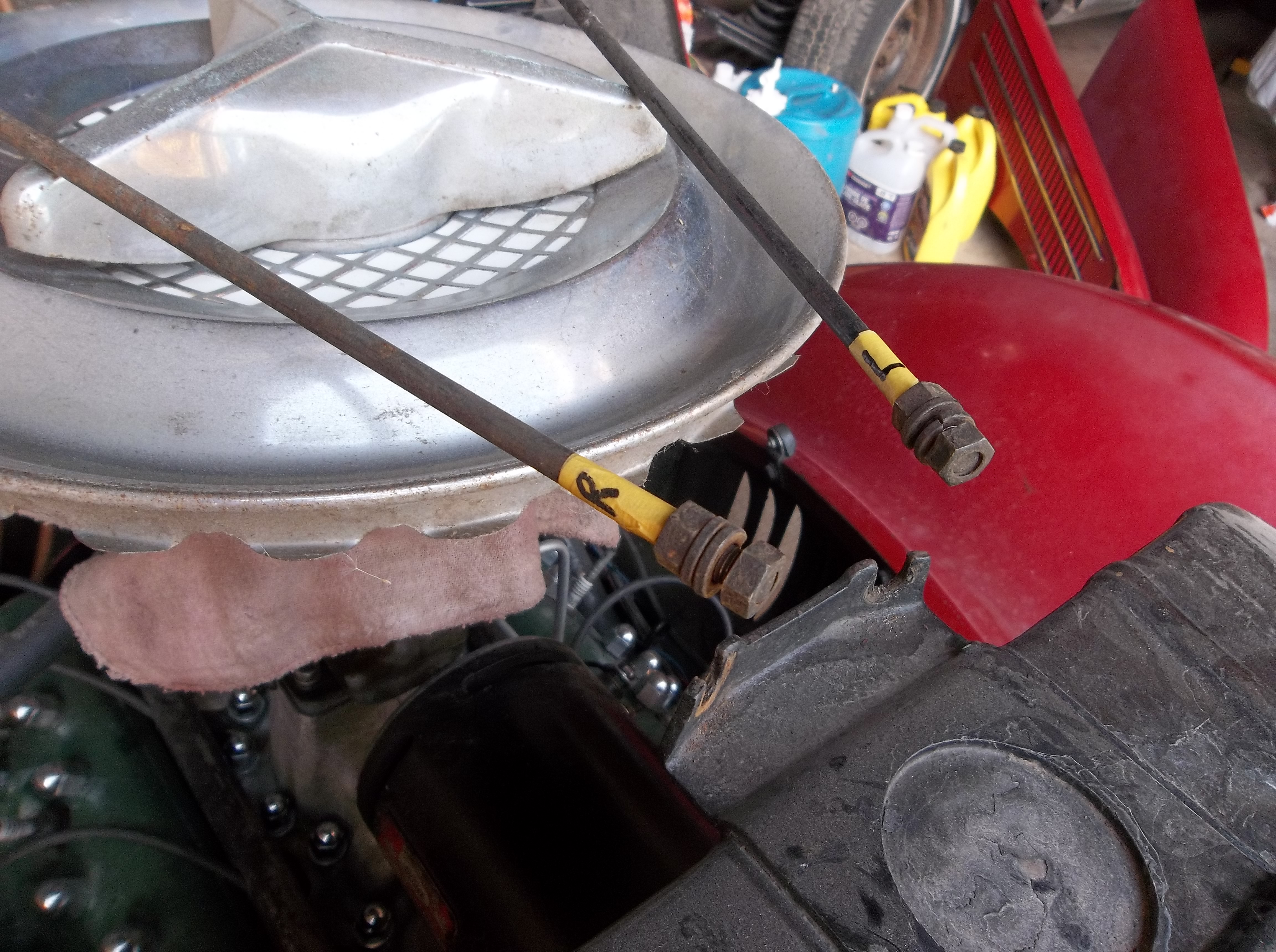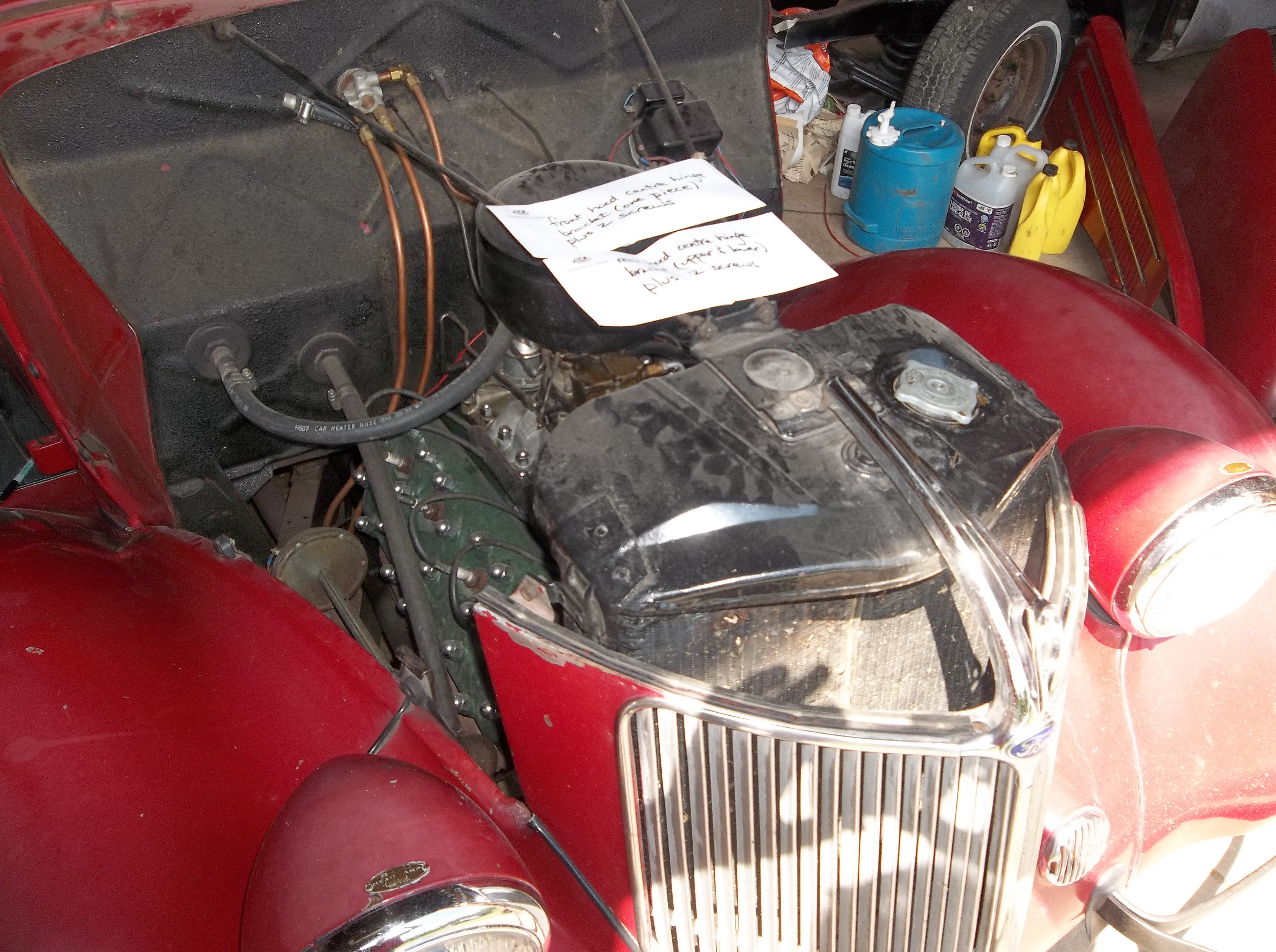 Photo 2 ...... Next the radiator support bars were undone (shown supported by a Fiesta flipper bar hubcap for the purpose of taking this shot). They are marked L (left) and R (right) for re-assembly later. A rag is protecting the top of the air cleaner. Not shown is a thick piece of cardboard inserted behind the rad to protect its cooling fins from being damaged by the fan or the distributor. Unlike John, I had decided to take the grille right off. Removing water pumps was therefore not necessary, and as an added bonus the front of the engine was fully accessible for cleaning and painting while the radiator was out being repaired.