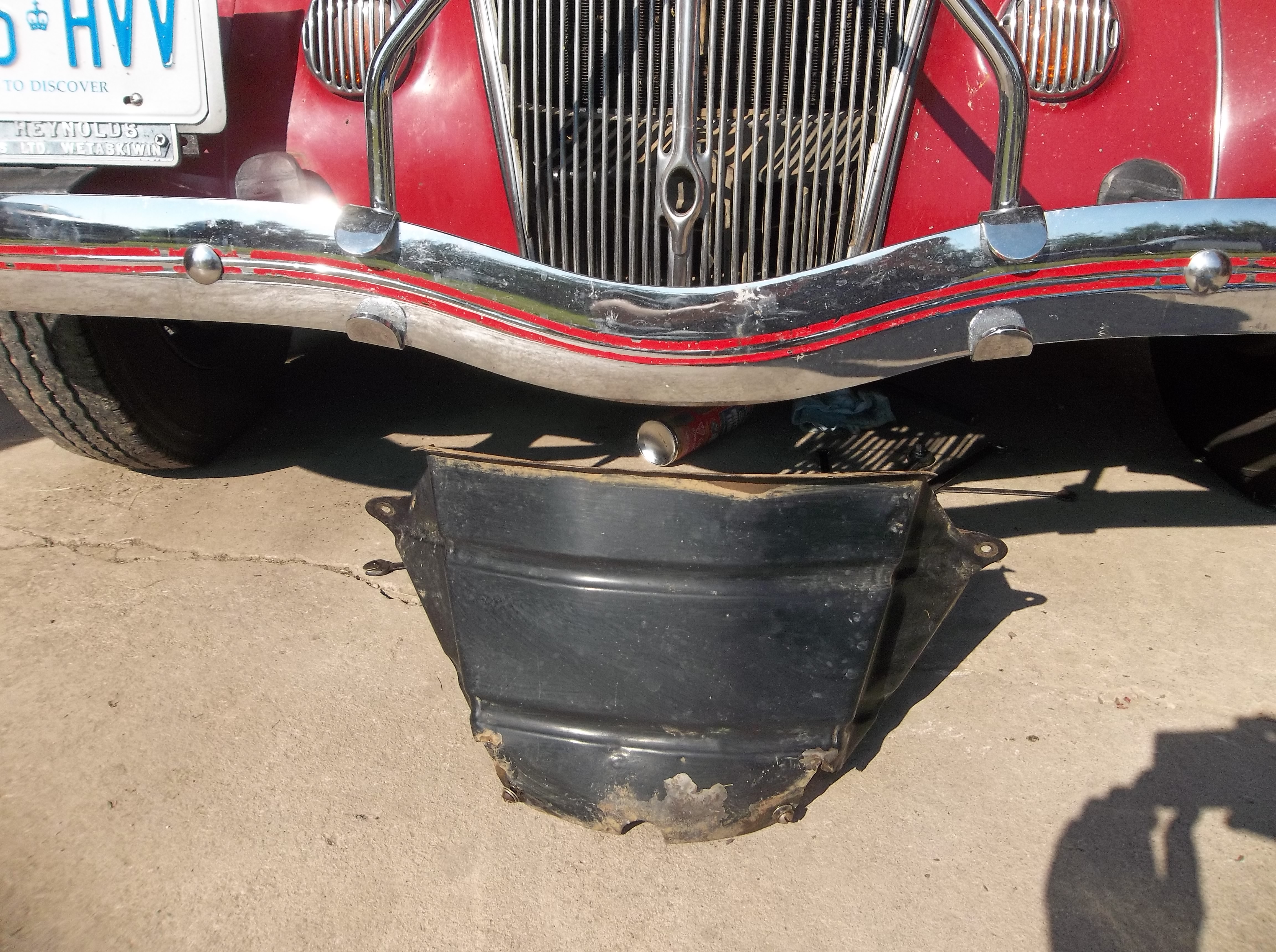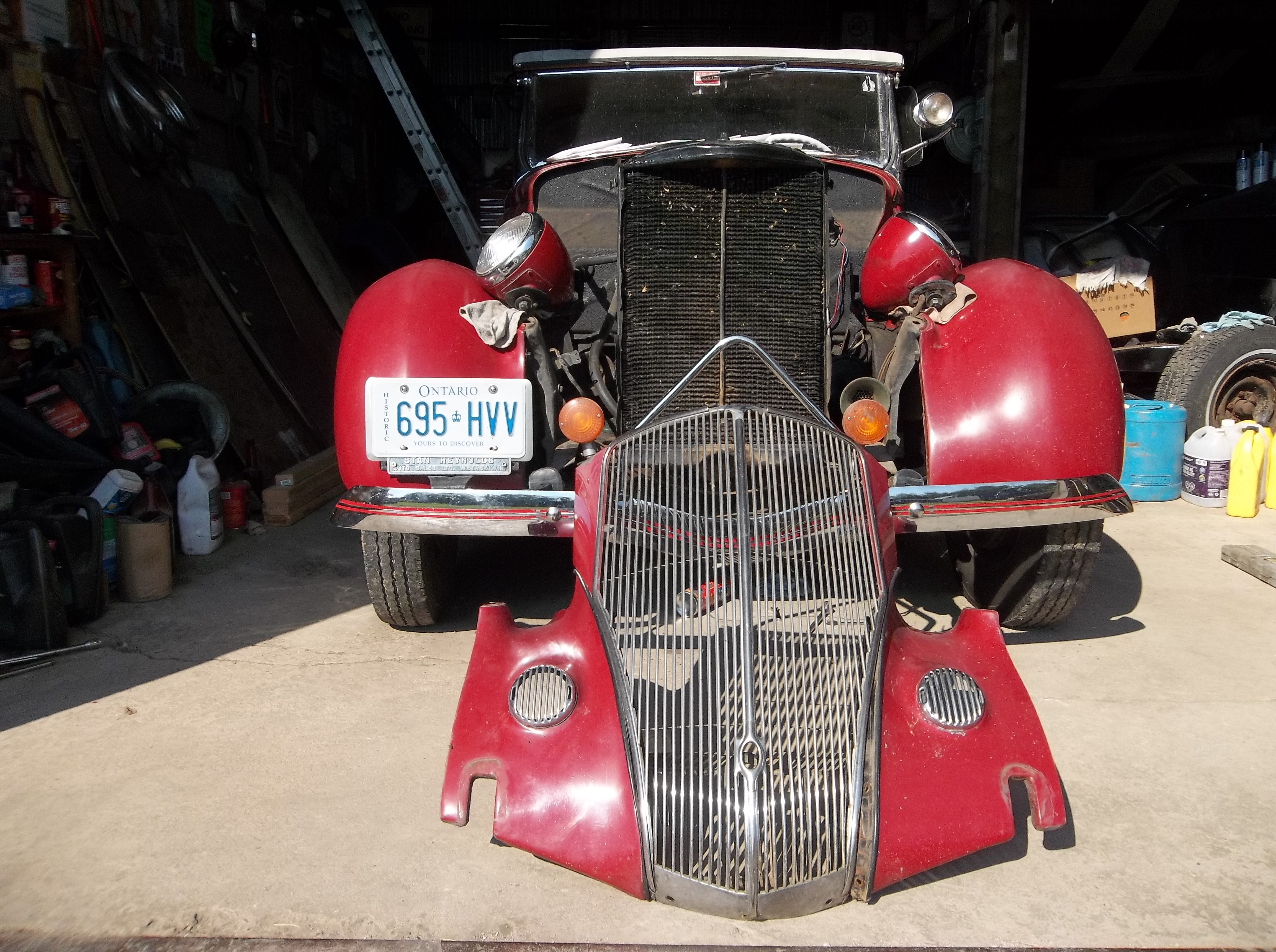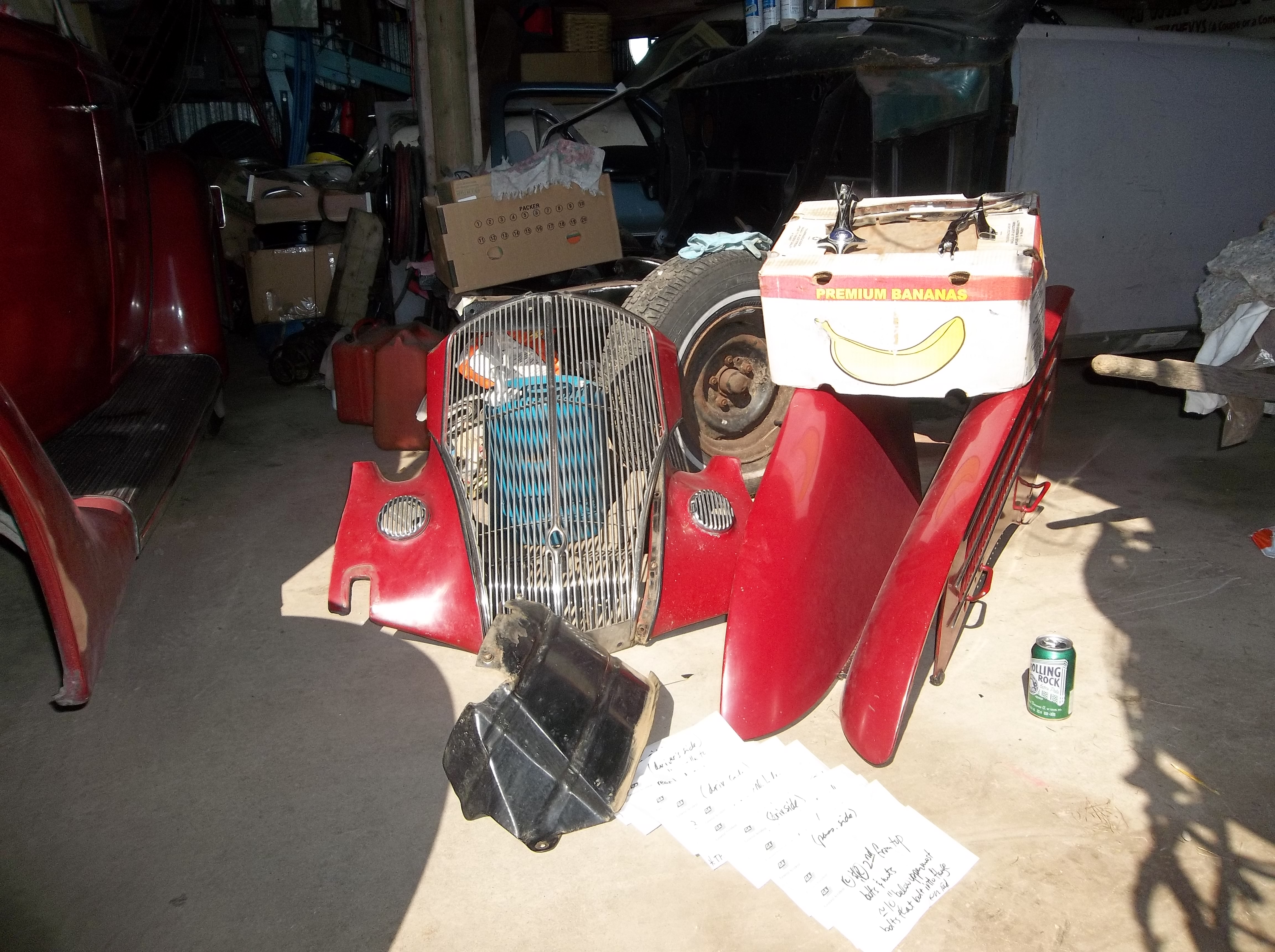 Photo 4 ...... The headlights have been laid back on rags. Next the horn panels and grille were removed. I'm thinking that the different front end on your 1935 Fords would allow you to take the grille off ........ or maybe just loosen it and tilt it forward ......... without having to remove the headlights or horns. Perhaps this decision will be driven by whether or not you want to clean up and paint the engine while you're waiting for the rad to be re-done.