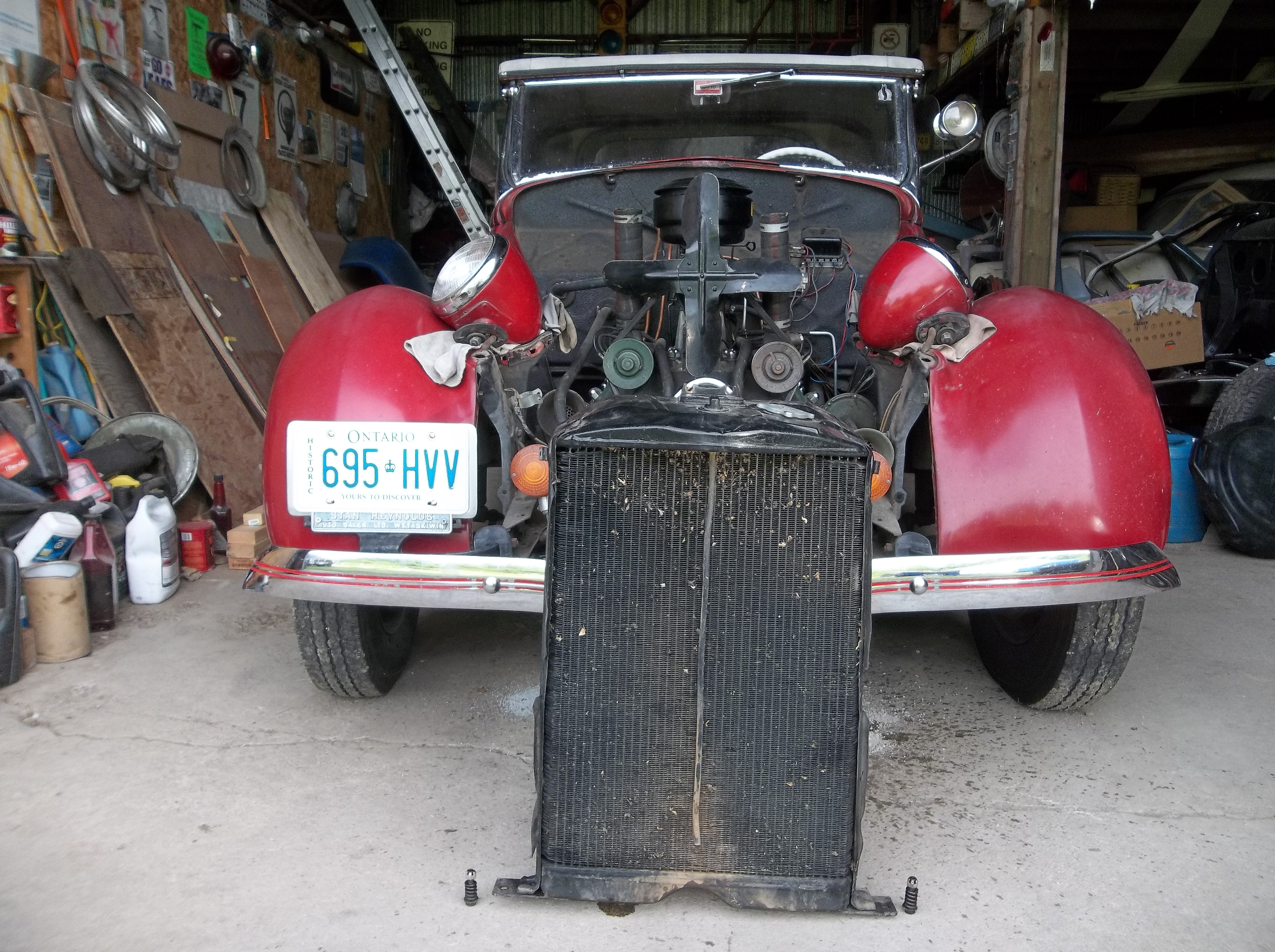 The way I remove the radiator in my '35 is......drain coolant using petcocks on either side of lower front block. Remove hood, and hood ornament Remove upper and lower radiator hoses, unclip the headlight wiring harnes from lower radiator tank, remove the radiator to firewall support rods, generator and fan, both water pumps, distributor, lower radiator mounting bolts and springs, and all fasteners that hold grille to radiator at top and sides. Then lift up on top, center part of grille just enough to allow the top tank of the radiator to lean back out from under the grille. Then very carefully lift the radiator up and out of the engine compartment
