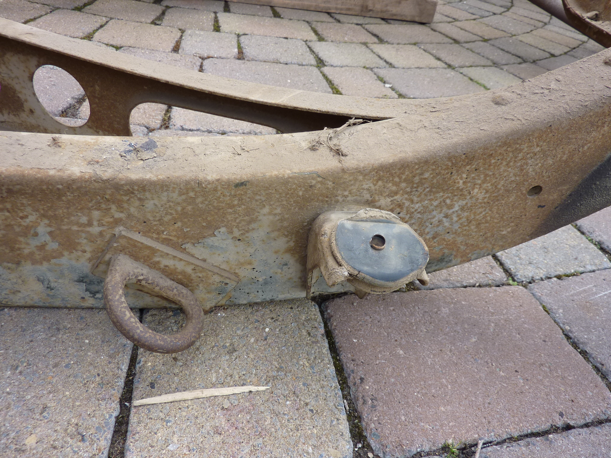 Hi Woodie You are correct, my car is a 42 Fordor 2GA-73C sedan with the G series 6 cyl motor as built for the US Army. It has parking light 'deletes' on the front fenders, blackout lights front and rear and original olive drab plastic parts on the dash. The tie down loops (eyes?) are something (IMO) that is also unique to these cars. I don't have the 'Green guide' so I can't say if these parts are shown in there. Here's another picture, this time showing one of the loops on the frame, prior to removal . MT