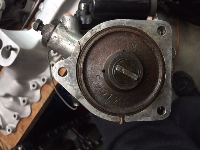 Thread the 2 bolts int 2 of the timing gear cover holes just enough to make them steady. Slide the distributor onto the bolts and turn the rotor so that the tongue of the distributor engages the slot in the camshaft and the distributor is flush with the timing gear cover. Install the 3rd bolt finger tight to hold the distributor in place. Then replace the cut-off bolts one at a time. Tighten all 3 bolts evenly after making sure that the distributor is flush with the timing gear and the tang on the distributor is engaged in the camshaft slot.