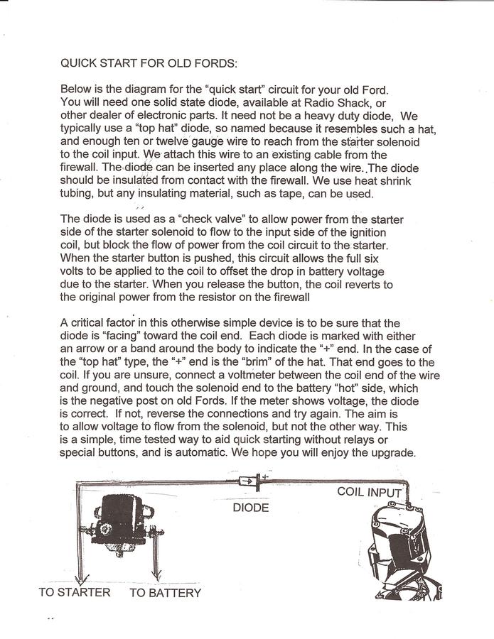 Thanks MG. I am still searching for the original. I had it on my old system, but switched from Dell to Mac, and I am still trying to add from one system to another. The "hot start" works fine. The only complaint I've had is when the diode is reversed. I address the problem on my instruction sheet. The diode is a sort of "check valve" that allows power to flow to the coil, but prevents it from trying to run the starter. The circuit doesn't handle high power, so the diode doesn't have to be heavy duty. Just be sure that it "faces" correctly with the plus end toward the coil.