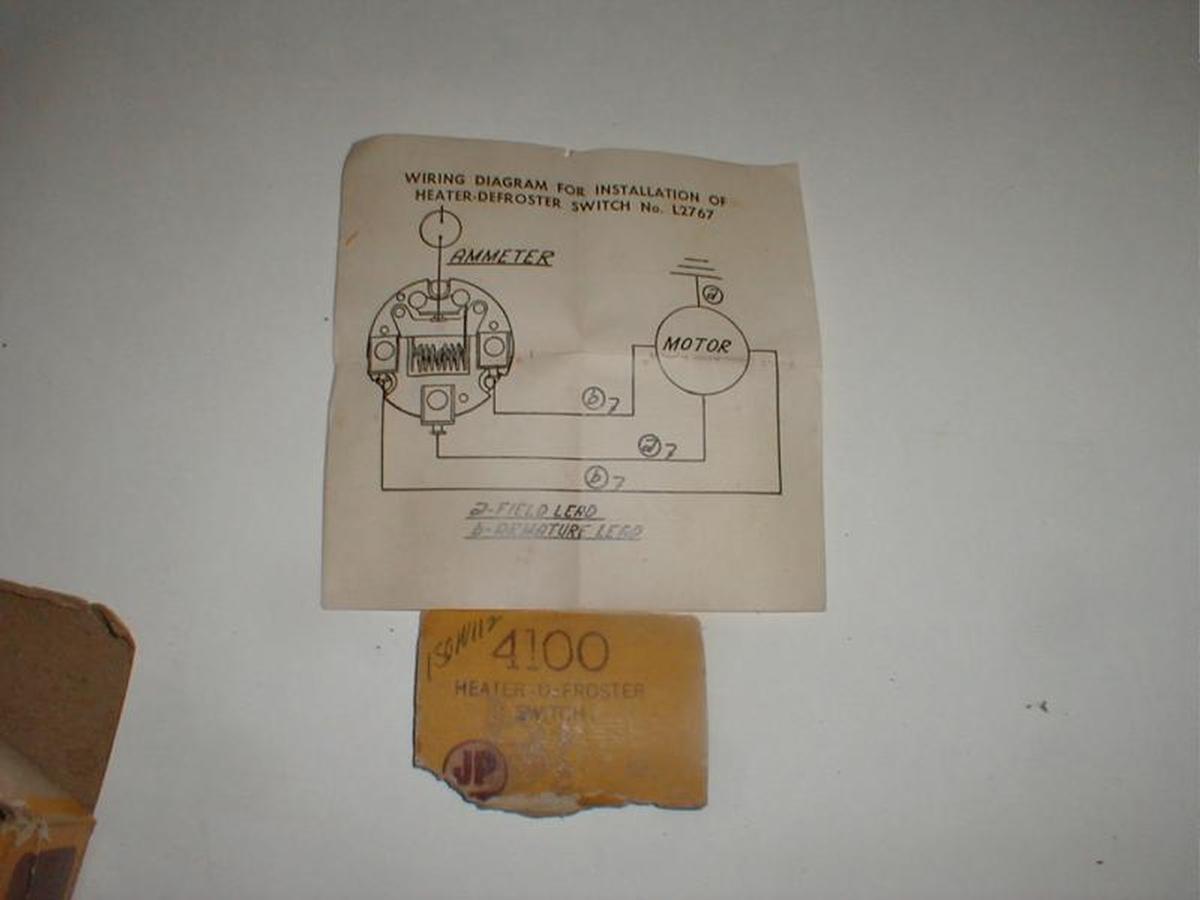 Hi all. Need your help to identify heater in my 42 Ford. I can't see a brand name on the box itself and want to hook it up (was installed in the car when I purchased but not hooked up). The motor spins free in the back which is a good sign to me. The switch has 4 settings: off, 1,2,3 (assume speeds). The back of the switch has 4 terminals. THE QUESTION IS HOW TO HOOK UP THE 4 WIRES TO THE SWITCH. Should there be a fuse between the heater and the power source? Thanks in advance!!