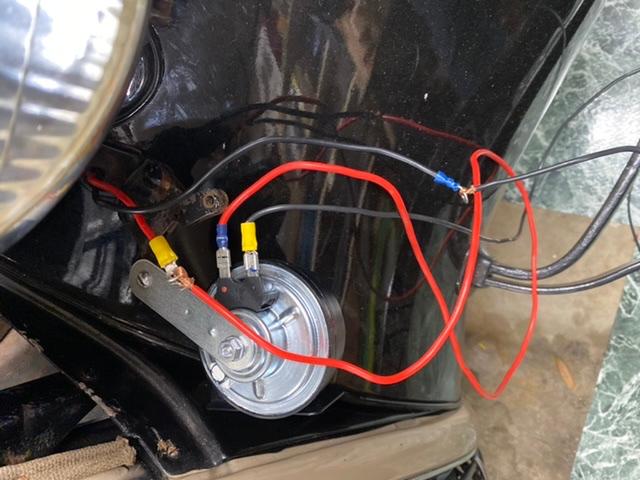 I got my replacement Spartan 12v 1935 horns. Here is what I have done today. I bought some cheap new hi low note horns from the auto parts store. I bolted them to the original horn brackets. The two terminals on the horns are not labeled. One terminal on each horn I ran as a ground to the bolt under the fender that secures the horn bracket to the fender. The other terminal which I will call positive, I ran a 12 gauge wire to my horn relay left terminal (the 3 horn relay terminals are not labeled) relay mounted to the firewall by a Star washer and bolt. The center terminal on the relay is run to the hot side of my starter solenoid. The terminal on the right I’ll call switch, I hooked up to one of the horn button wires coming out from under the steering shaft. The other wire I taped off. I have installed a 25 amp fuse between the solenoid and horn relay. Both horns sound when the original horn button is pressed. Now I guess I am ready to replace the cheap horns with the expensive Spartan horns. I am a little worried as I shorted out a previous new Spartan horn and burnt up a second. I reordered more horns so I now have $1000 invested. Does it sound like I can proceed? I have 2 wires hooked up to relay terminal “H” on left (one from each horn positive).