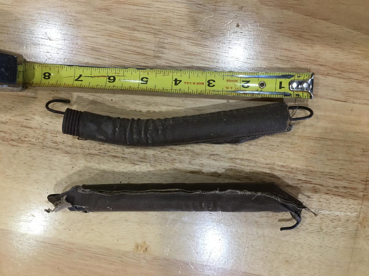 I found these two sheathed springs in my basket of parts for my 37 Model 74 Tudor Touring Sedan. They are about 7-3/4" in overall length. The springs are about 5/8" diameter.