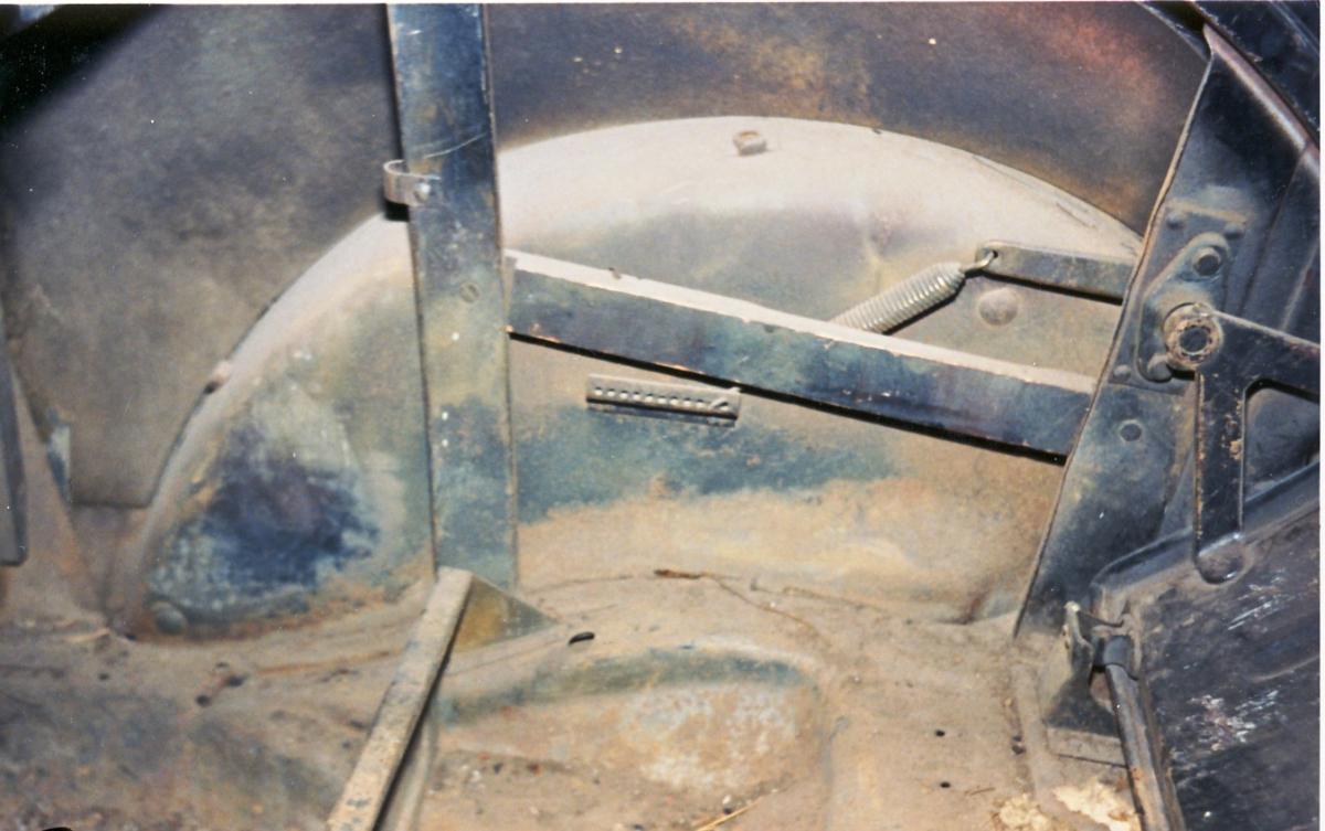 The spring-assisted counterbalanced rumble lid made its debut in the '32 deluxe coupe (3-window) and continued to be used through the '34 model year on coupes and the cabriolet. The photo below is of the '32 set up. The '33-'34 set up is the same except the stop bumpers were incorporated into the vertical strainers where the hinges pivot. The arms on the hinge shafts where the back of the springs attach also differs as the '33-'34 version is shorter than that in the photo. The springs and adjustment brackets spot welded to the wheel wells are carried over parts from '32.