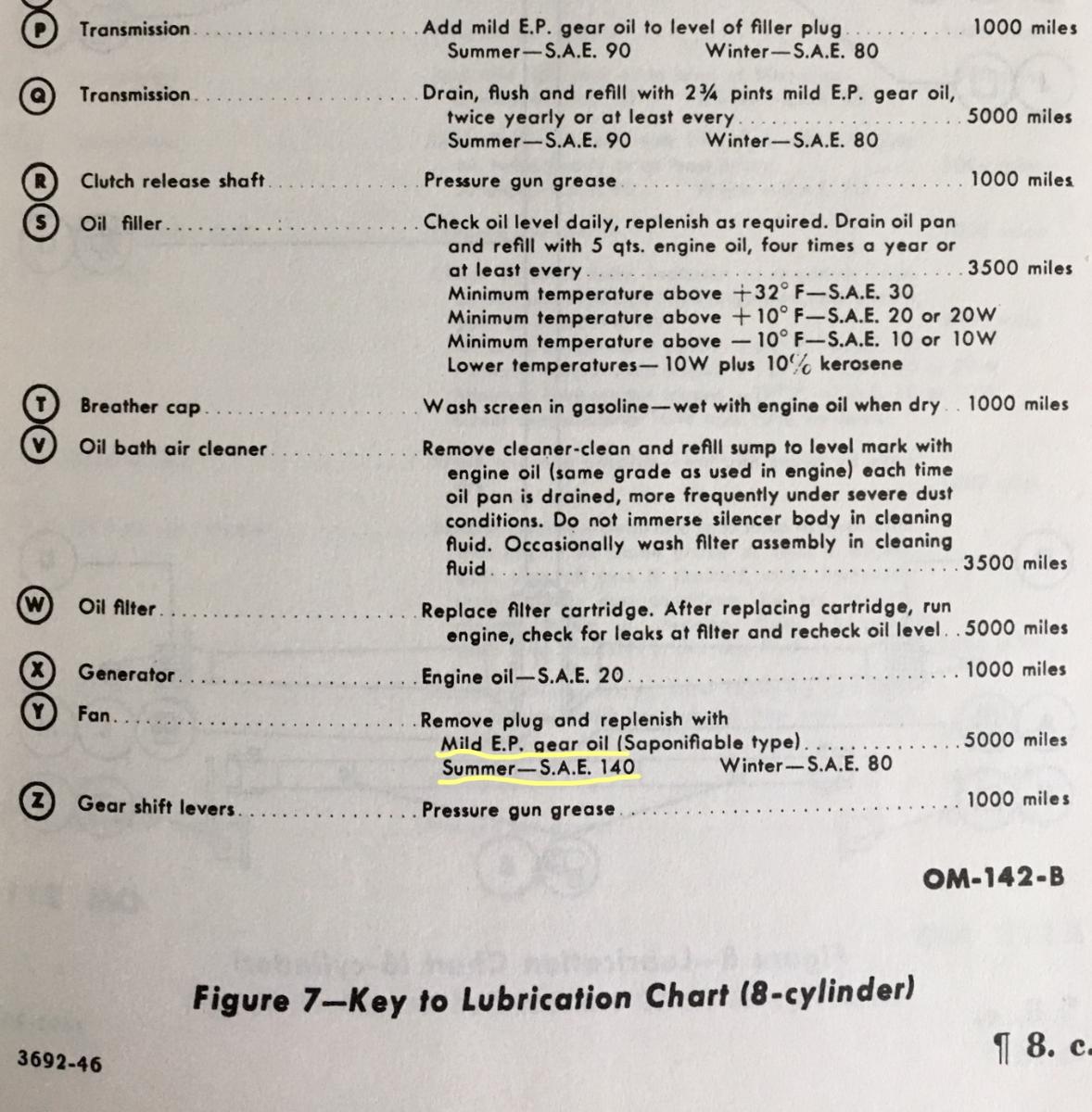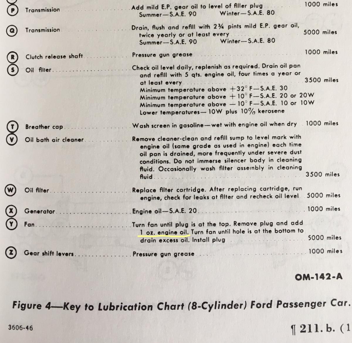 I looked in three of my manuals, and came up with three different specs. I have a stock "46 Coupe, and based on umpteen opinions on the various forums, I decided to go with HD30 for my fan lube. Right or wrong, it works for me...so far. Attached are snaps from the three manuals I referenced, and I underlined the spec's that Ford gave at the time of printing.