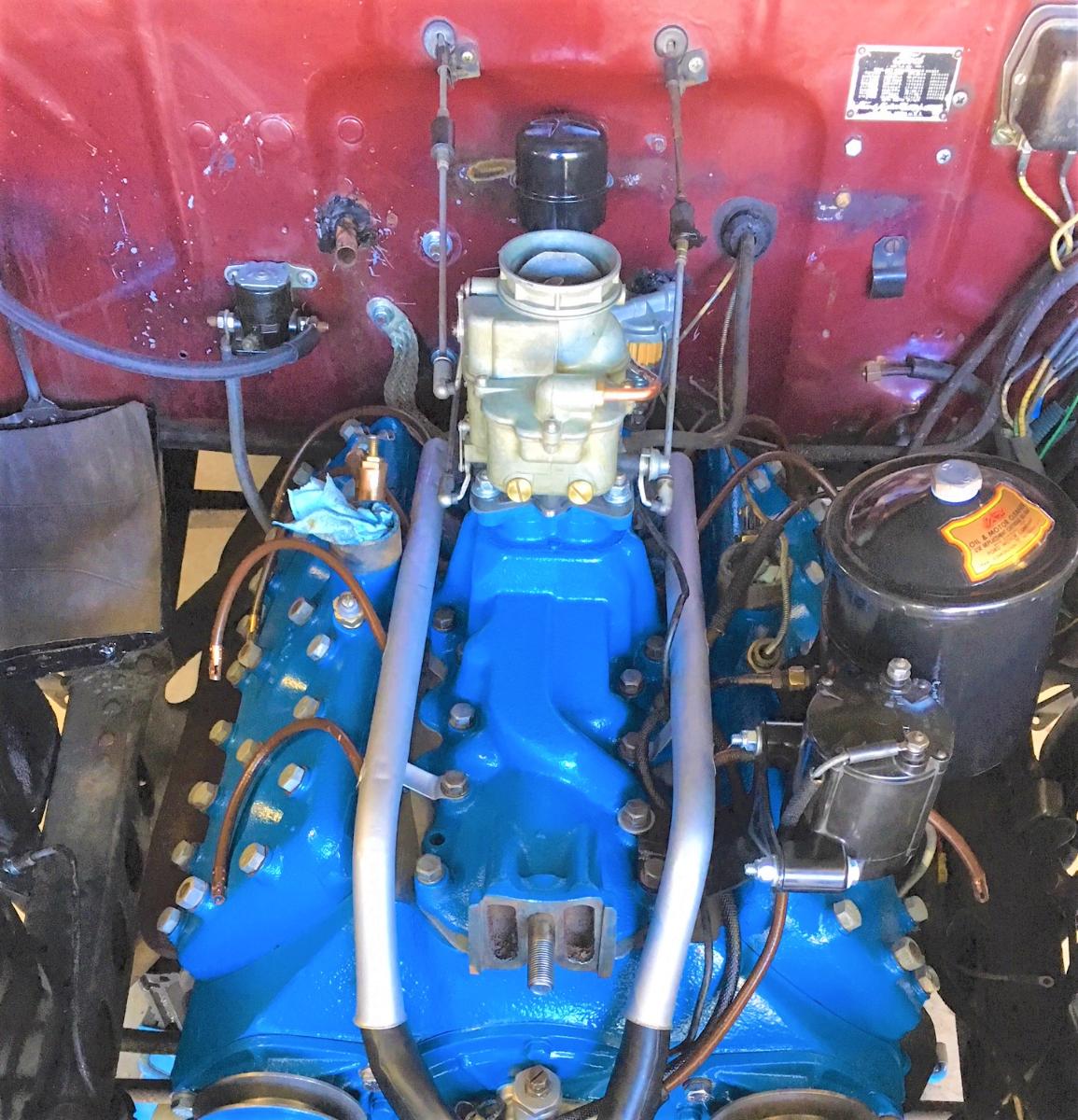 34Ford is right, it is easier to paint an engine out of the vehicle. With my '46, the engine was running great, so no need to remove it. Not being familiar with what the PO had/hadn't done, I pulled the carb, fuel pump and stand, intake manifold, distrib. and wires, generator, fan, rad, water pumps.... etc.. I covered all the holes that dirt/cleaner shouldn't get into, and with a large catch pan under the engine, scrubbed the engine and engine compartment down with Simple Green. Rinsed with hot soapy water, wire brushed, washed again, then wiped every thing down twice with grease and wax remover. I masked the firewall fender wells etc. I went to a local hydraulic shop and bought enough plugs and caps to cover the head nuts and spark plug holes so I didn't get paint on/in them. The caps, fit nicely over the nuts, and the flange on the cap covered the washers. I cleaned and painted all the fender wells and the parts I took off, using the same cleaning process, then reinstalled. I know the plug wire conduit are supposed to be black, but I thought...., hey, at my age, why not live on the edge!