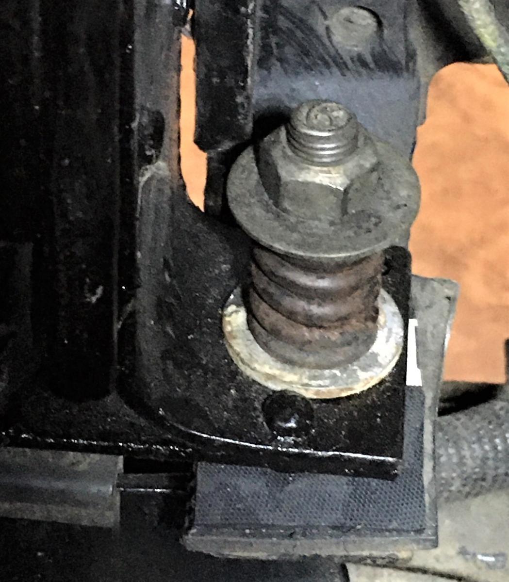The rad mounts just as Ken described. In my case, the previous owner used Stover locking nuts in place of the correct castellated nut and cotter pin. The brown in the background is the "drip catcher" on the floor. When I opened the attached picture, the spring looks like it is "coil bound" but it is not. Make sure there is space between the coils of the spring when you set the nut.