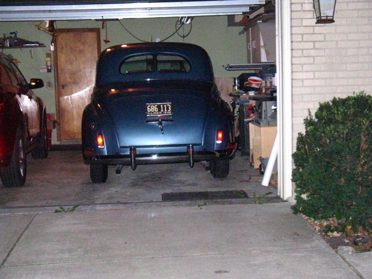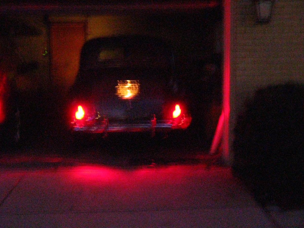 I finally got a chance to take pictures of my LED tail lights. I was not able to get the brake lights, because I did not want to crawl under the car to bypass the switch and could not get anyone to put their foot on the brake. The first photo is with the lights from my modern car shining on the car from about 20' and the second photo is without any extra light including no flash. The lights look blurred due to my shaky hands and long exposure. I do not have a comparison shot with the old bulbs. Tom