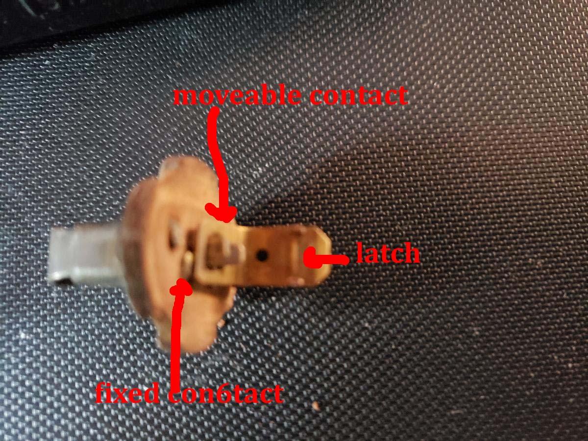 Without having a switch in my hands, I am just guessing. Here is the way that I think the switch works. I have labeled what I think are the 2 contacts in the switch, you can verify this with an ohm meter. With the switch in the IN position, the contacts should be touching. When you pull the switch out, the piece connected to the knob pushes the latch enough to open the contacts. The way that I would try to get it to work is: Connect an ohm meter between the 2 connectors on the back of the switch. With the switch apart, you should have continuity between the connectors. If you do not have continuity, bend the moveable contact so you will have continuity. When you have continuity with the switch apart, try assembling the switch with the meter connected and the kob pushed in. If you lose continuity, try rotating the parts slightly to regain continuity. If a slight rotation will not restore continuity, bend the latch slightly away from the piece on the knob.