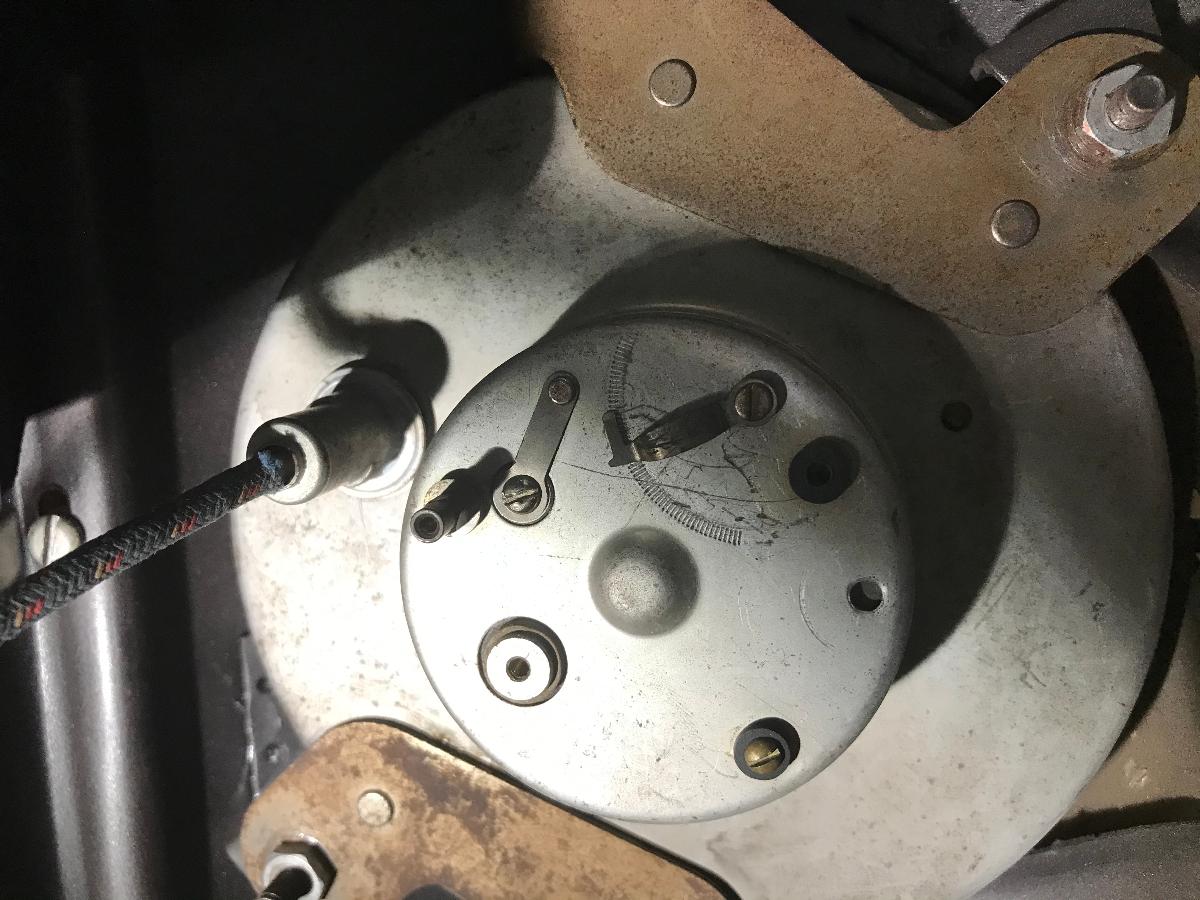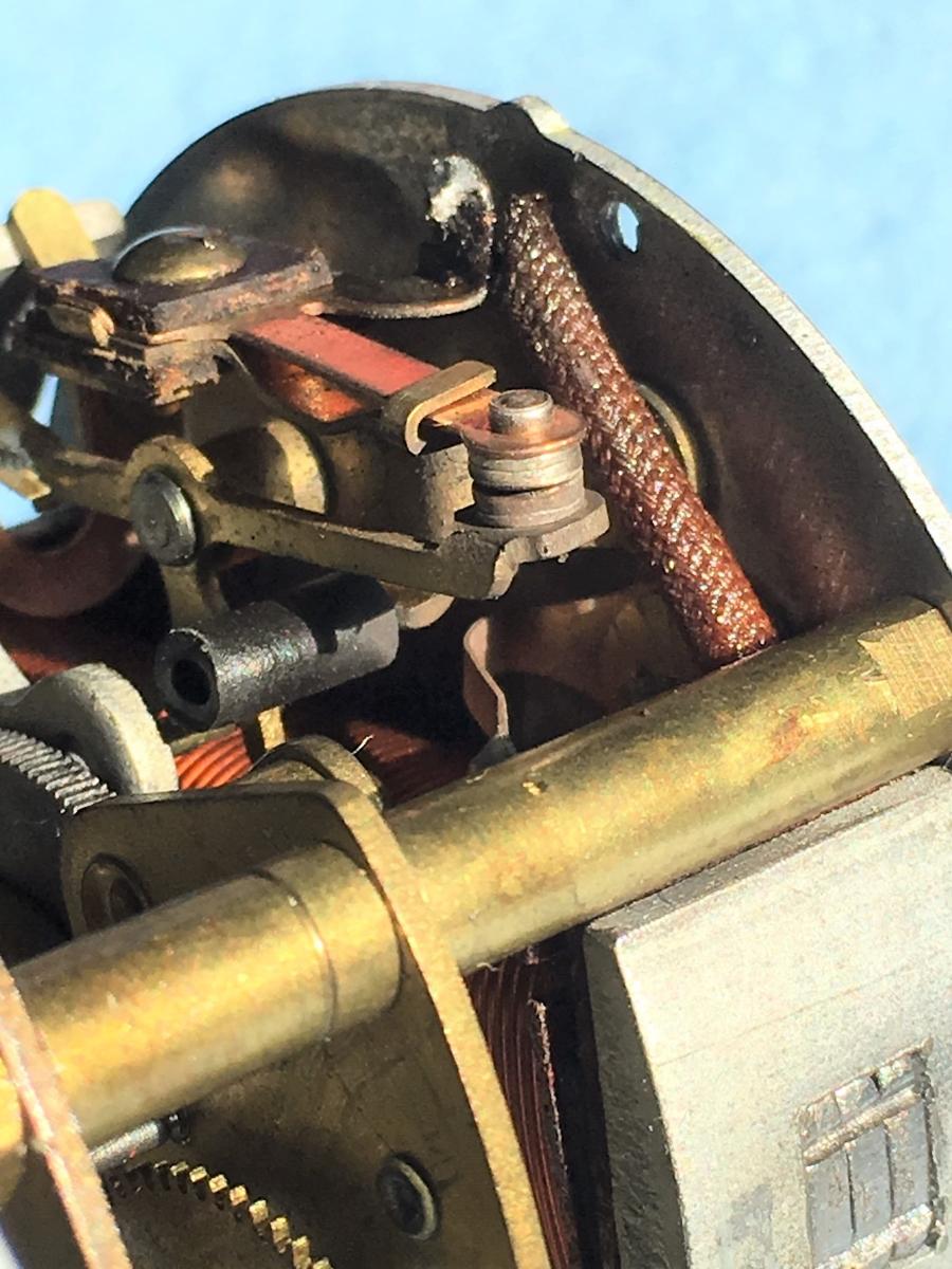 James. I thought I had the answer, but my '46 clock is different than your '47. Hard to tell from the picture, but is the "post" that sticks up next to the light socket a possible connection point for a bullet connector? can you take the small cover that has the speed adjustment off?