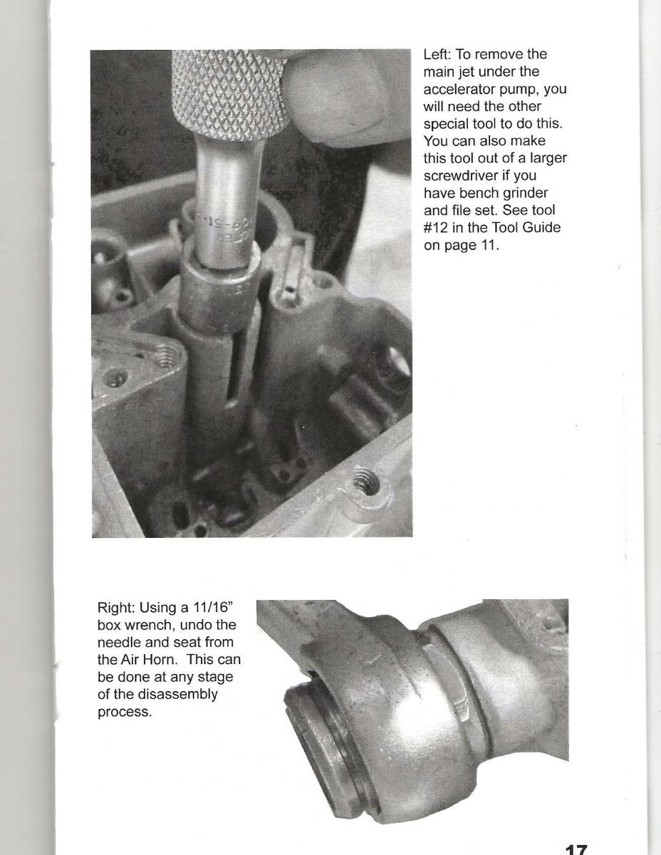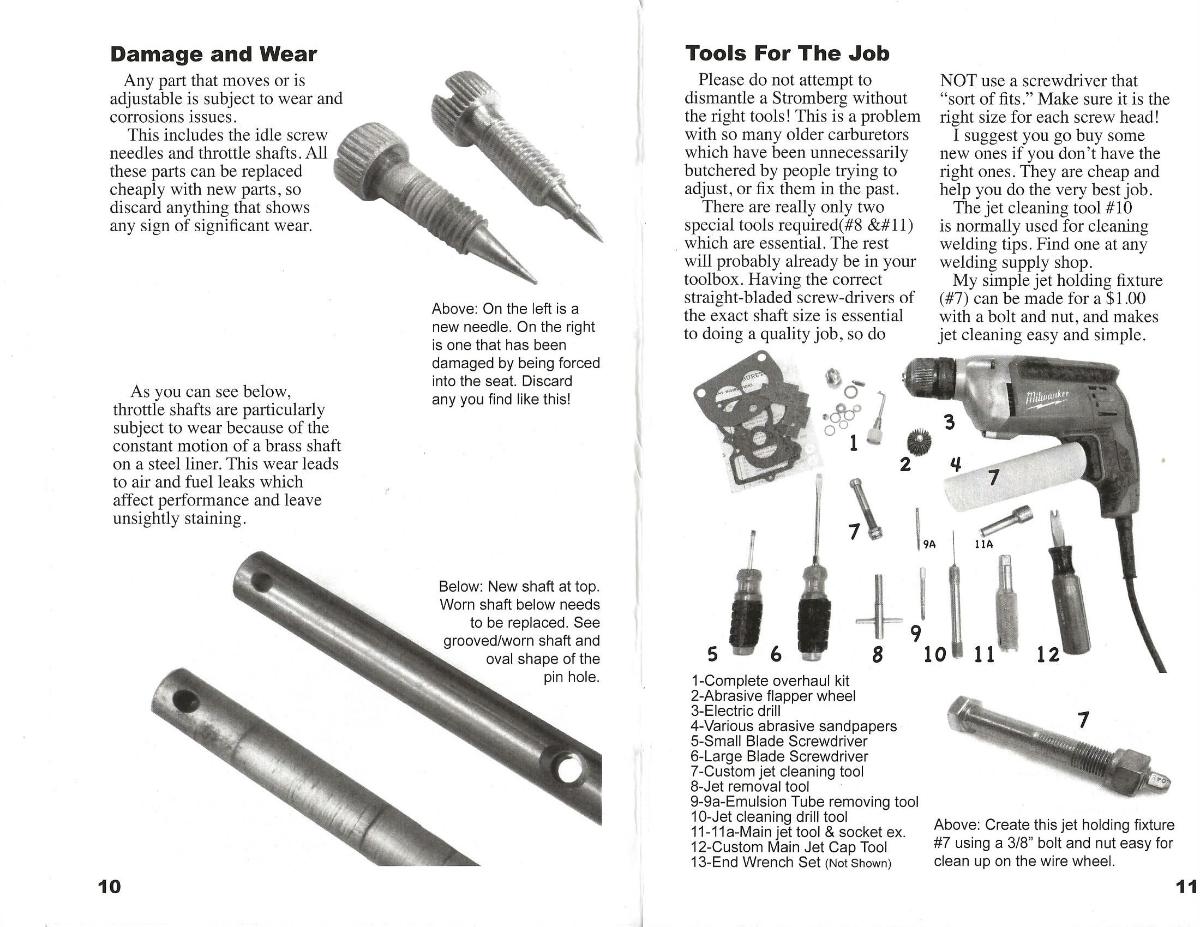 I have purchased Vern Tardel's Stromberg 97 help book. Please see the attached photo. I am interested in Tool # 11 and Tool # 11a. Tool # 11 -- What is tool #11 ? Where can I get one? What is it called? Tool # 11a -- Is this an ordinary socket extension? If so, what size? Or is it a special extension? Tool # 12 -- What size screwdriver? What are the dimensions of the modification? Vern says that tool number 11 is "essential". I wish he could have provided a little more detail. I went to the Stromberg page and that tool is not offered. Any help with tool number 11 and 11a and 12 greatly appreciated.