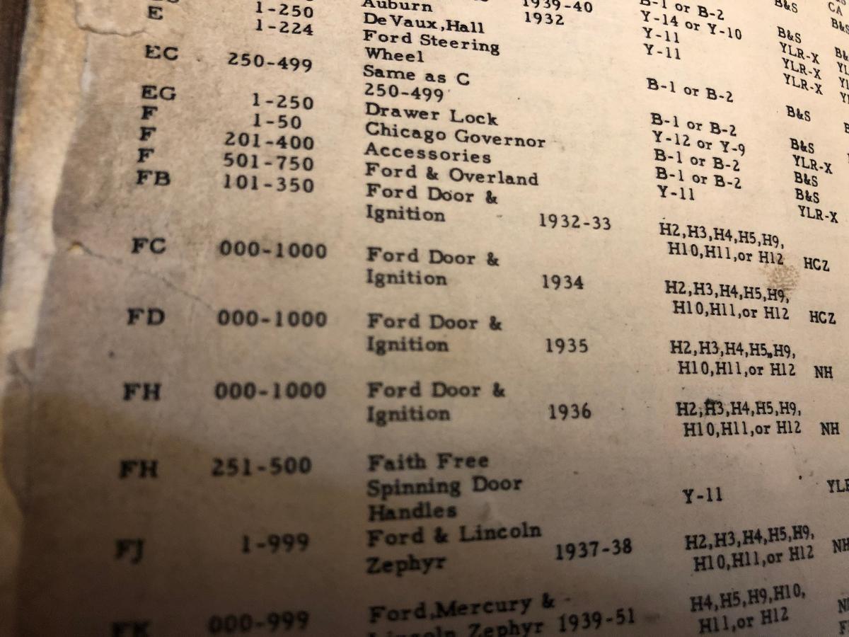Below is another table of cylinder prefix from 1952 showing FB as 32-33 and FC as 34 prefix. The table above is for the 32-33 lock cylinders. Very interesting how FT is a replacement for FB .