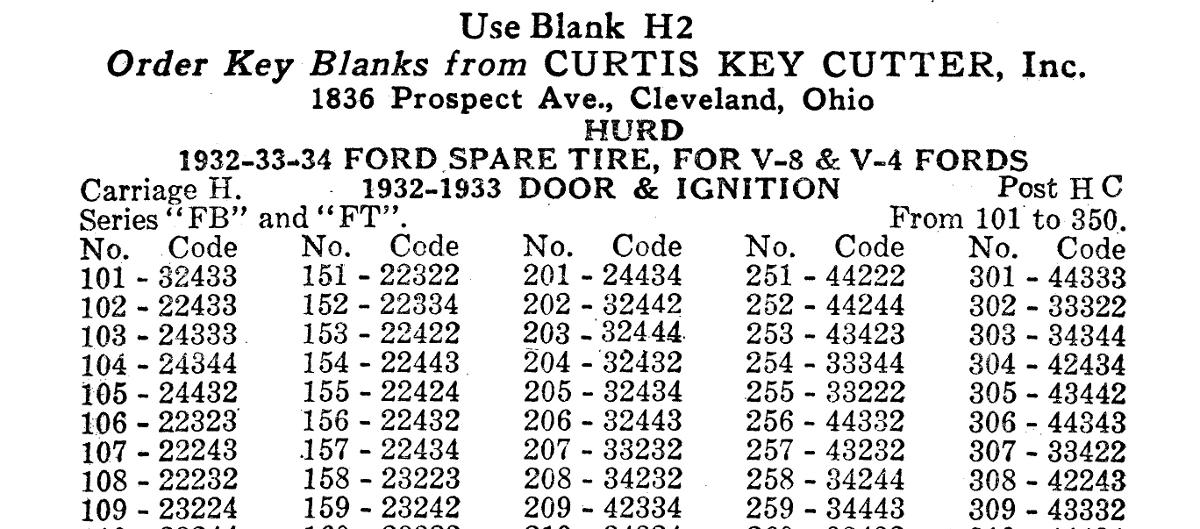 For clarification.....FB was the original prefix for 32-33-34 key cylinders, BUT as time went on Curtis repeated the code listings and FT had the identical code set as FB. Later Curtis key books showed code listings for 32-34 cylinders under both the FB and FT prefixes. If a lock cylinder was replaced in later years, say 37 or after it probably would have the FT prefix.