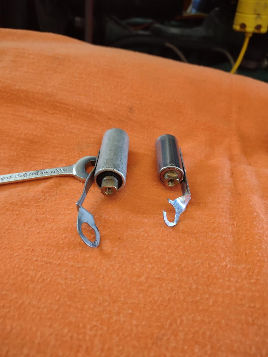 Tom, I ordered and received condenser ECH FA49 from Napa. I finally had time to installed it today. Why is it a simple task becomes extremely difficult? After connecting thenew condenser to the coil I could not get the coil to seat. Nothing seemed to work. I removed the coil and condenser and compared it the one I removed. The grounding flang is 180deg off from the removed condenser. See the attached pic. I attached the original condenser and the coil seated easily. Also note the size difference between the new and original. Any help would be appreciated. Thanks
