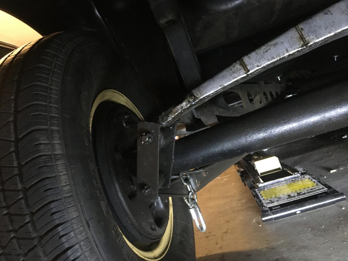 As you can see the bar doesn't look like the one in the books. It was on the car when I bought it and had no trouble with the links, shackles, spring, etc. I'll try to load various angles so you can see where the spring eye flipped upside down and how the bar fastens to the car.