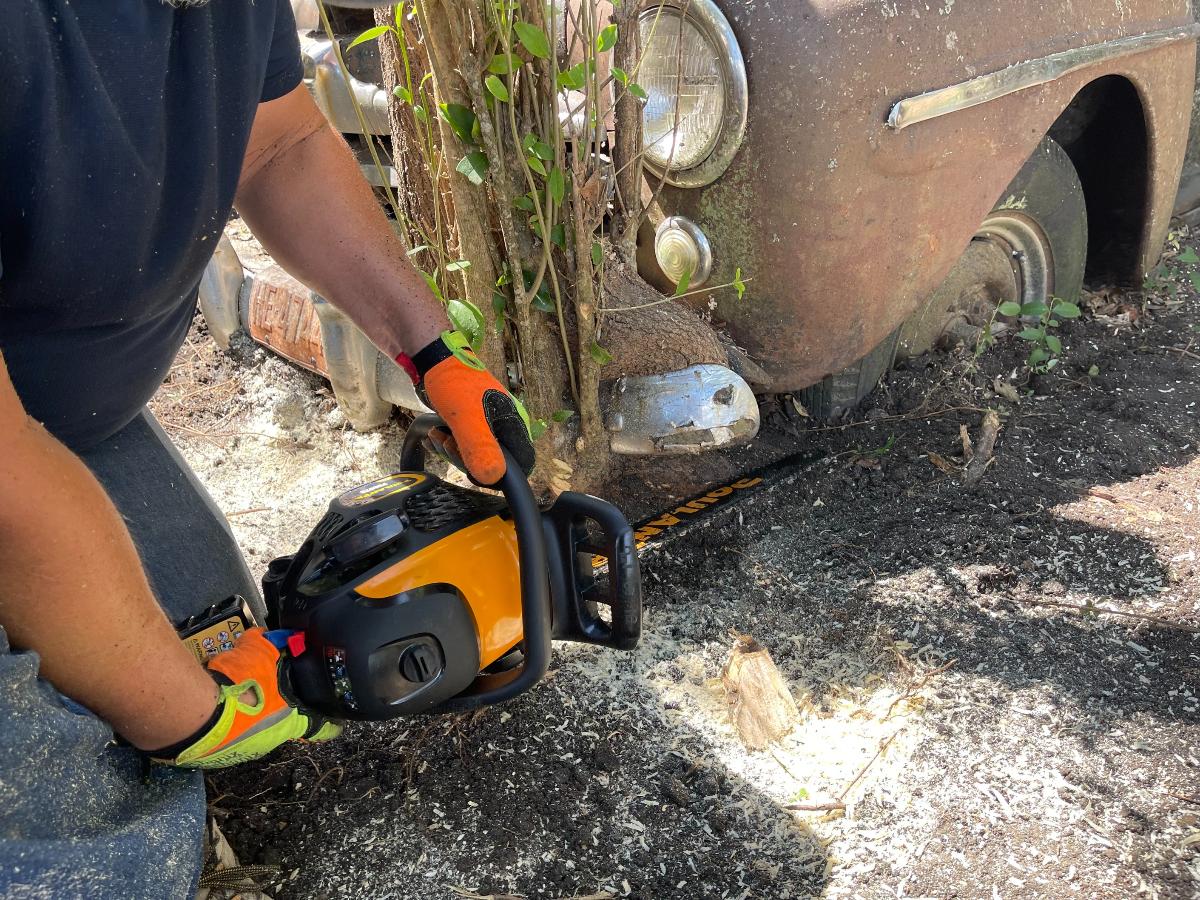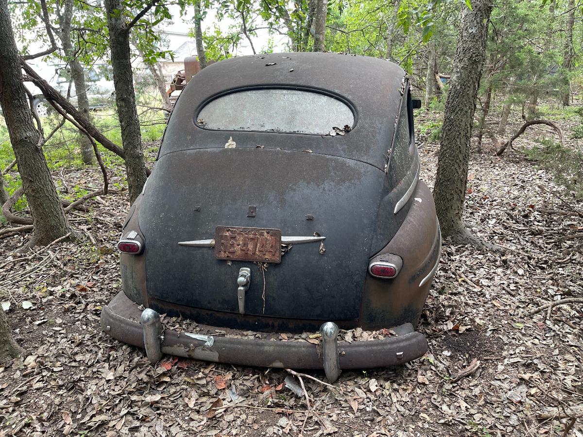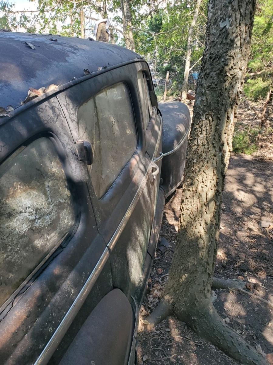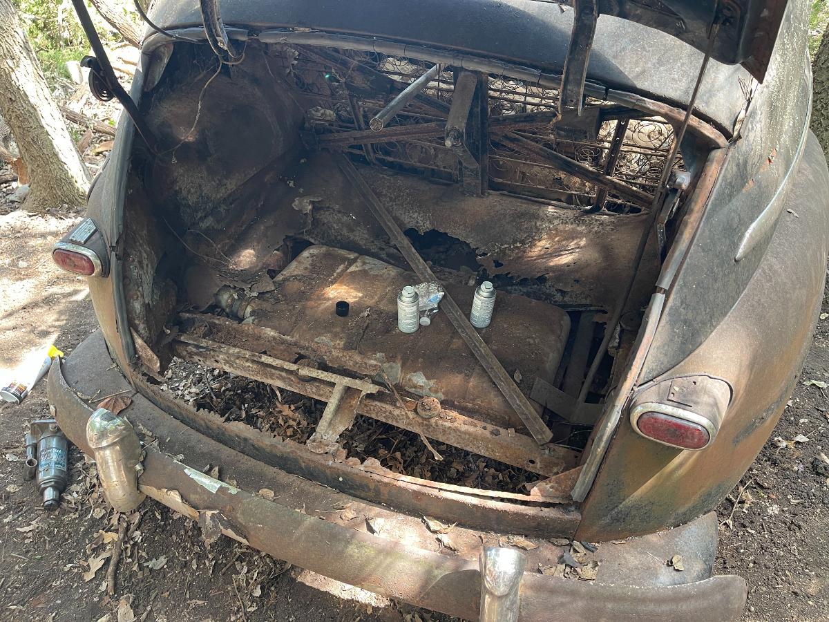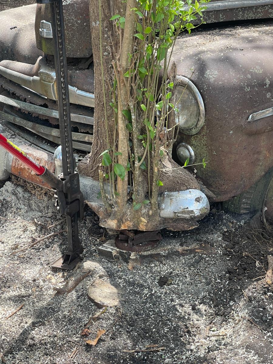 By now, most of you know that the timing on the matter of the '47 was fortuitous because IF were we successful in getting it out and, IF a few other necessary things fell into place I would have something to add to the annual Halloween display. After which time, I would have an engine to play with without any guilt whatsoever if it turned out to be a klinker. Besides, one can appreciate a car even if it's not a runner. The same applies to engines. If the engine is junk, there's no reason why it can't be tidied up and made presentable. Who doesn't love the aesthetic of a flathead Ford V8? So, here we are, with all this potential goodness, firmly pinned to the ground by a tree, and as it turned out, a few OTHER surprises as well. This sort of endeavor begins with sizing things up. We would require shovels, picks, rakes, certainly a chain saw and a variety of jacks. Hi-Lift jacks, bottle jacks, low-profile floor jacks were all used, along with any number of large wood blocks which were employed to keep things up in the air. By the way, if you happen to have a motorsports business in your area; one that sells things like CanAms and such, those often arrive at the dealership with large center cut wood blocks as part of their dunnage. The dealership in my area can't wait to be rid of those and I'm always happy to take a few as they are a very necessary part of the hobby. Our number one effort would be to preserve the wretchedness of the car. I know that sounds crazy but that was really all the car had going for it at the moment. Our plan of attack was to cut the tree (obviously), jack the car up somewhat, dig out the wheels, remove them and put wheels on the car; wheels I pilfered from one of my rollers, then pull it out. But first we had to get into the car because things like dealing with the possibly the car might still be in gear and having access to the steering DO make the already difficult job of removal far easier. Naturally, it was all locked up....or so it seemed. The hang up turned out to be rust upon rust and that required using both the inner and outer handles simultaneously to get them unlatched. Of course, at this point I didn't know that. So, assuming the doors were actually locked, I did what any good former cop would do and made an effort to get in the traditional way....through a vent window. All the rubber in the window moldings and door seals had long since turned to plastic so I chipped some away in order to make an effort to unlatch the vent. During a rest period I realized that it had not occurred to me to look in the trunk. The trunk latch would not turn but the lid came up with just a little resistance. The final remnants of rust gave way and....Oh look! A room with a view....of the ground!...AND the interior of the car because all the material on the back seat was g-o-n-e, GONE. What WAS there in the trunk was a rather good looking spare (no longer roadable but a rather lovely display piece) and the heads for the engine! So, with a big grin on my face for having located the heads, I temporarily abandoned my efforts at the vent window. With a longish steel rod with a ring at one end, I was able to run it through the springs of the seat back and manipulate one of the window crank handles and get a window rolled down just enough to be able to work two poles across the breadth of the car and manipulate a vent window catch open. From there, it was all downhill. I got another window opened fully and then got the doors open, one by one. This was not my first rodeo. There are two takeaways from this. The first thing was something I already knew and that is, vehicles in this condition can and WILL fight you. The best way to fight back and achieve your goals is to look for weaknesses and exploit them. Sometimes it's better to let the car guide your efforts rather than stubbornly follow your own plan. Fellas, there is almost always more than one way to skin a cat. I would not have been further ahead to pursue my original plan of getting into the car through the vent window. The second thing is to examine not only the top and sides of the car, but also the UNDERSIDE. Had I seen the condition of the trunk floor I would have been in the car far earlier. Since the door panels were toast, it was easy to access the workings of the door catches and with generous doses of PB Blaster I worked the latches (and hinges) until they moved freely. I deal with a great many rusted things and penetrants are an absolute necessity. These small victories keep a project moving forward. Rome wasn't built in a day and the car had been sitting there for 60 years. If I didn't succeed one day, I would return and succeed the next. Here's the set up for what comes next. The ground in the area where the car had been parked was rather loose which made the digging easy. It was a combination of detritus from the trees and silt from the run-off from our occasional heavy rains. What we found was, the ground was actually higher around the wheels than elsewhere on the car as they tended to captured the stuff being sluiced through that area. So we dug around the front bumper and the base of the tree. I have a bad back (from too many years of wearing body armor and battle-rattle) and the business of cutting that tree off at the base was no picnic. In fact, it was so difficult that I would cut for about a minute, then rest and I did that over and over again. Let me tell you....that tree was as hard as woodpecker lips. There was no quarter given by either of us. I just attacked, attacked and attacked until the cuttin' was done. Which reminds me, I need to send a Thank You note to the folks who make Ibuprofin. This business of freeing up the car was accomplished over a period of a week. What with time and tide, my days of working until I fall over in a bloody heap are over and it's not my age, fellas. It's the mileage! We used the Hi-Lift jacks to lift the front of the car...the idea being that this would also lift the