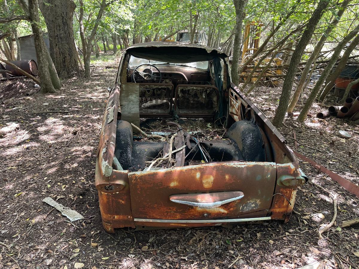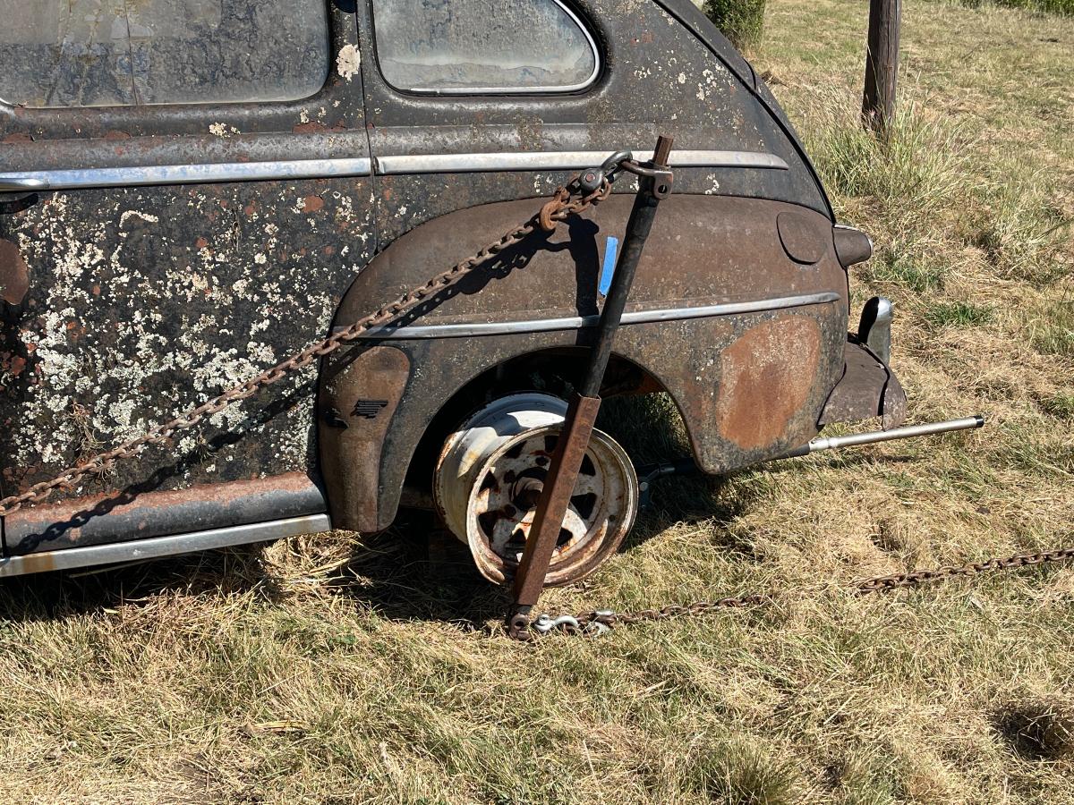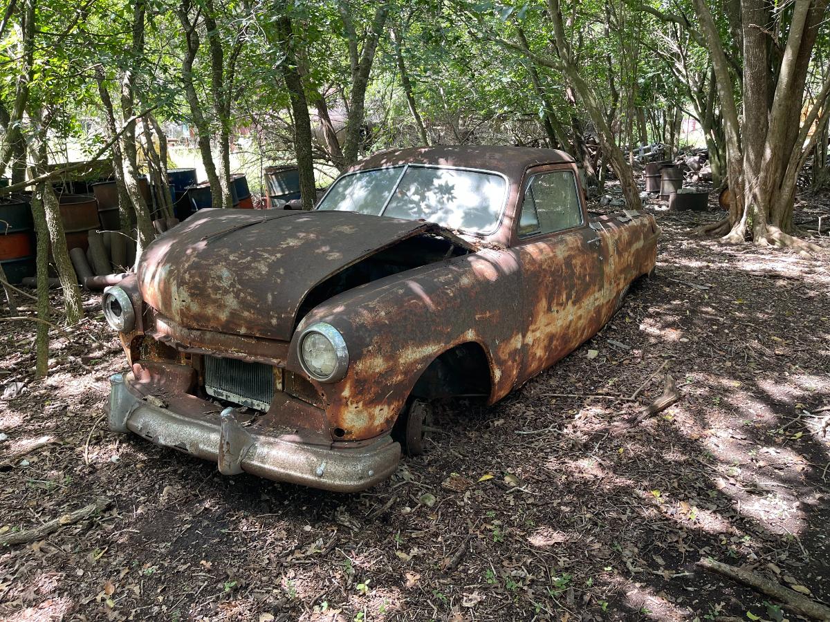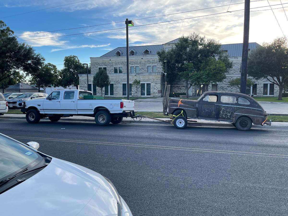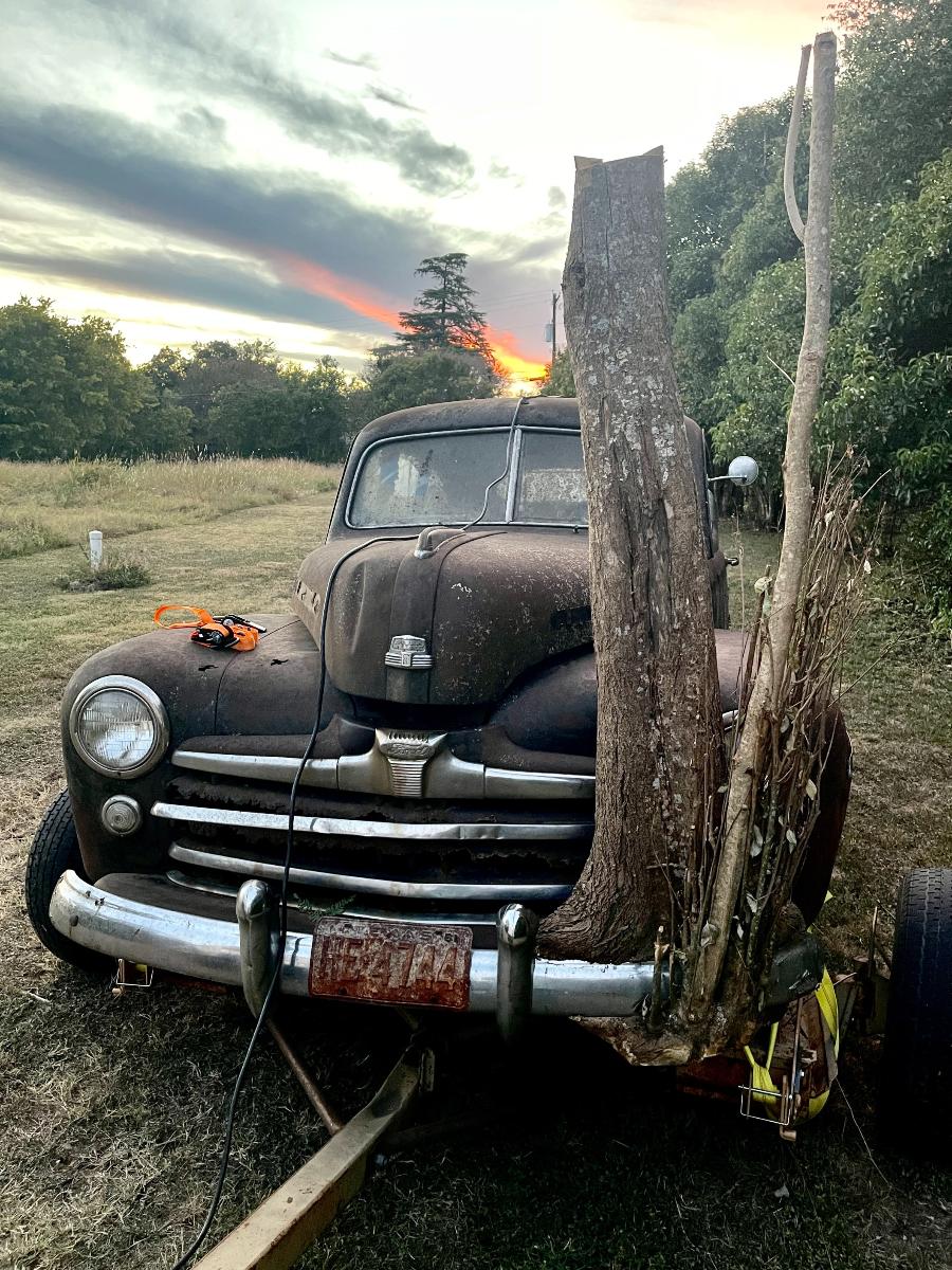 Frank, had been monitoring our progress. He is a mechanical engineer and I'm pretty sure he had at least some appreciation for what we had been up against. On the other hand, old cars have been part of my life for many many years and between all those oldies, the four years I spent in Afghanistan and the seven county fairs I have been to, there isn't much I haven't seen. So, when Frank saw us pulling Nails in circles around his house by means of a chain, WITH ALL FOUR WHEELS ROLLING, he came off the porch to enjoy our victory laps. We rolled past Frank three times because as they say, THREE is the charm. There was also purpose behind this because whoever happened to be behind the wheel at the moment would be listening for strange, dangerous noises...like screeching metal on metal or the rumble of unhealthy wheel bearings. But, aside from the grinding of rust nodules being relentlessly reduced to dust in the brake drums, there was nothing to indicate trouble. In fact, when we finally stopped in front of Frank, Nails actually rolled backwards until the chain was taught which was a VERY good sign, if I do say so myself. Sharing in our victory, Frank grinned from ear to ear. "Frank", I said, "I think we're going to go get my tow dolly. I'm feelin' lucky." After loading up Nails, Frank sauntered over and told me he had something for me in the house. When he returned, he handed me the ancient Texas title for Nails with several registration receipts attached to it. WOW. I had not seen that coming. THANK YOU, Frank! Nails was officially mine...every little rusty, nasty, awful bit of her. We towed her over to a local restaurant for a victory dinner and parked out front in a place of honor; a horrible-looking car with an actual tree growing out of the front bumper. Certainly NOT something one sees every day. Absolutely filthy, we walked in like a couple of war-weary Spartans, washed up and ordered dinner like we owned the place. Victory dinners are not only mandatory, they are exceptionally sweet. And with just enough daylight left over, we brought Nails to her new home. Kindest regards, TJ