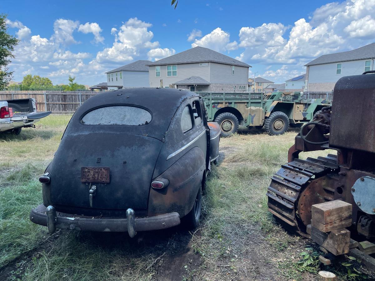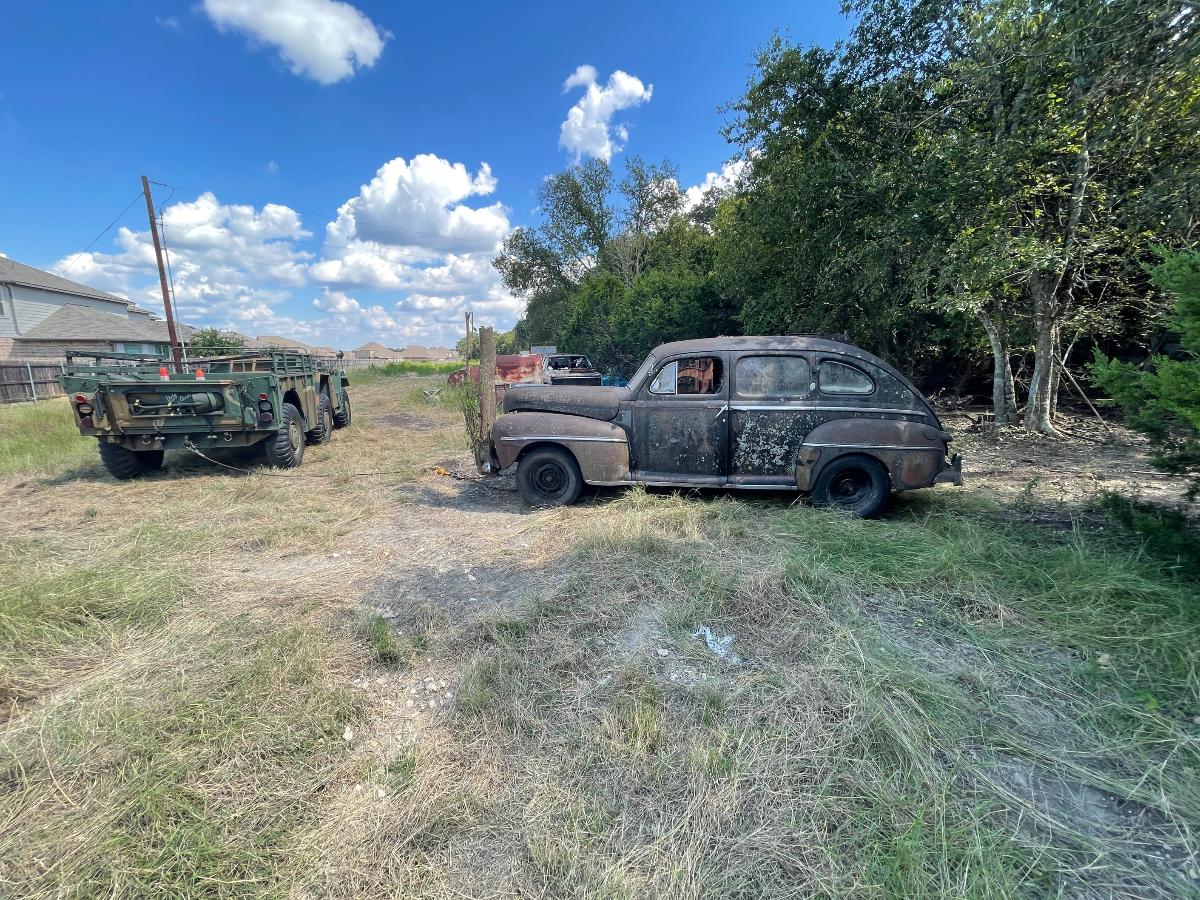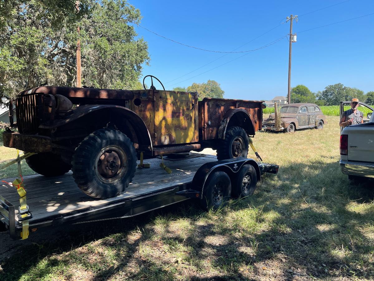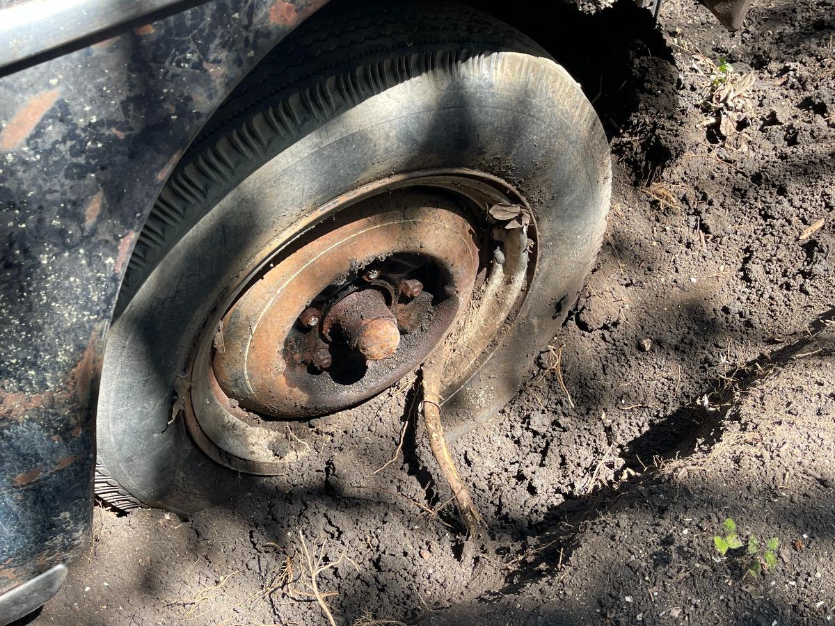 So, there we were, at 10,000' AGL with only one parachute between the two of us..... Oh wait! Sorry...that's another story.... So, there we were with the right wheel refusing to come up out of the ground. Well, there were hundreds of little viney, rooty things entangled in the front suspension...none of it of enough consequence to really hang things up THAT much. So we (meaning, I) dug some more and uncovered a root as big around as a man's...um...thumb that had grown through one of the narrow gaps in the steel wheel. My buddy Bill took the easy side, the lucky sod! Digging out around the outside of a wheel wasn't so bad. It was INSIDE the wheel that was the real bugaboo. The car was jacked up and blocked up so there was no real danger but it was a very close, very tight space to have to work in. Having to do it over again, I would have gotten my reciprocating saw and made a slice right down into the dirt and call it a win but at that point my muses had fled the scene altogether and I was left to my own devices, armed only with stubbornness (and a shovel) to get me through. Once that root was finally cut, lifting the front of the car became a simple mathematical equation and off came the old wheels and on went the roller wheels. I will admit, they do look highly questionable but every one of them has a tube inside and that, making them round and capable of holding air, is really the only point of roller wheels. We were able to jack the car up high enough that it paid to pack the dirt back in below the tires before setting it back down now much higher and happier. The process was repeated on the rear end in far less time, we being wiser about what to expect from early buggy-style suspensions with transverse leaf springs and our also being...root-less. (Is that a word?) Suddenly we had a car that was ON the ground, rather than IN it. By this time, the car had fought us harder than the M37 ever did if you take into account all the cutting and digging. Would it roll? Could we squeak it out from between the trees? After hooking up tow-chains, cables and a sheave in order to guide the car out of the tree corral to a place of safety, Dirty Gertie got involved once again and with her motivating the poor, sad thing it moved. It ACTUALLY moved! Yes, for the first time in SIXTY YEARS, the '47 Ford Super Deluxe made its way out of the woods and into the bright Texas sunlight....dragging its dirty little feet all the way. Finally, it was out of what would otherwise have been its grave. The wheels would not roll, or break free and roll and it was at this point, the car got its name. NAILS. As in, 'as tough as nails'....because the car certainly wasn't cutting us a single break. Plus, Nails is a heckuva lot easier than saying Forty Seven Ford Super Deluxe which is a mouthful in any language. Wheels that don't turn just aren't practical. You guessed it. More to come! Cheers, TJ