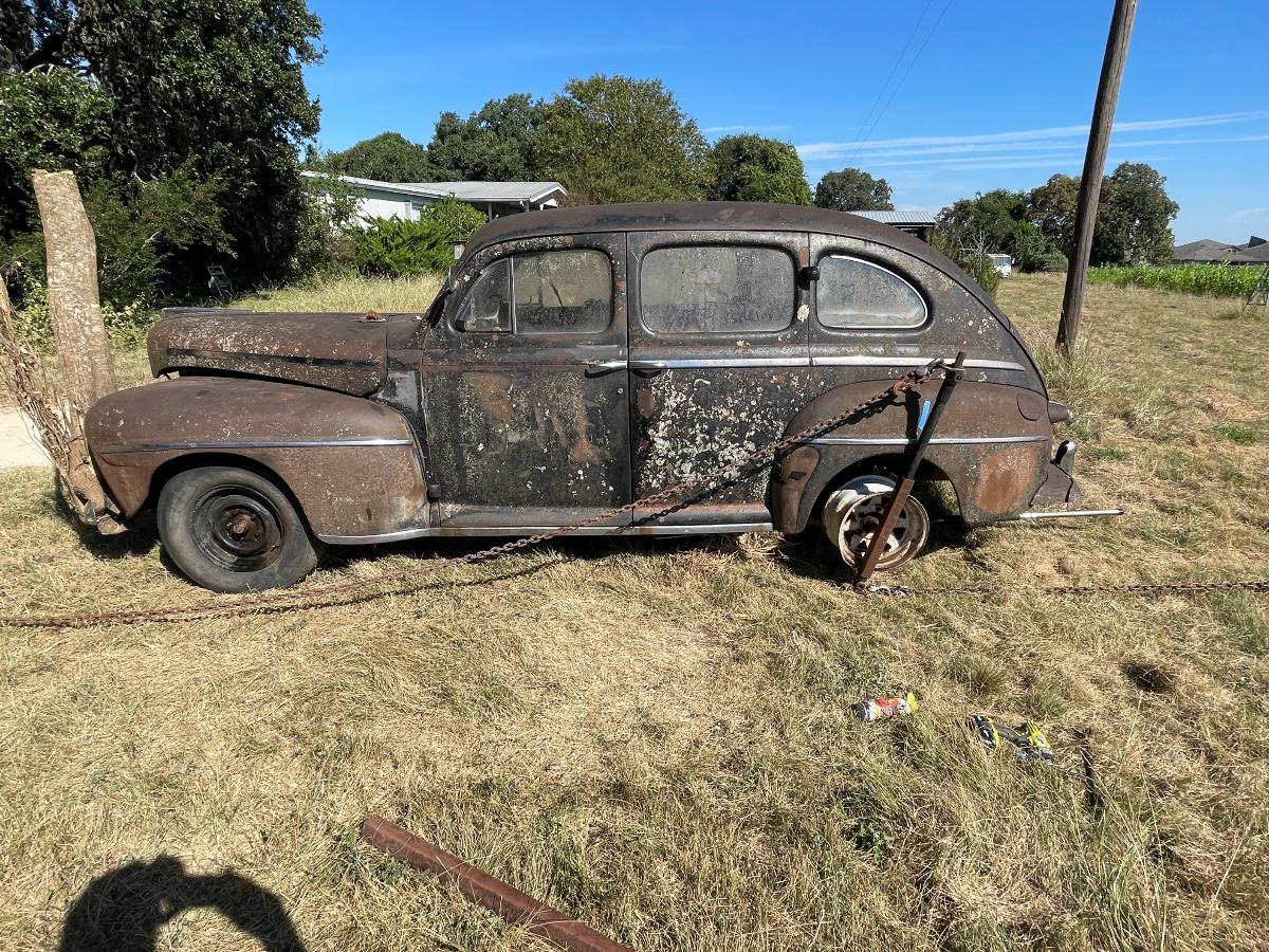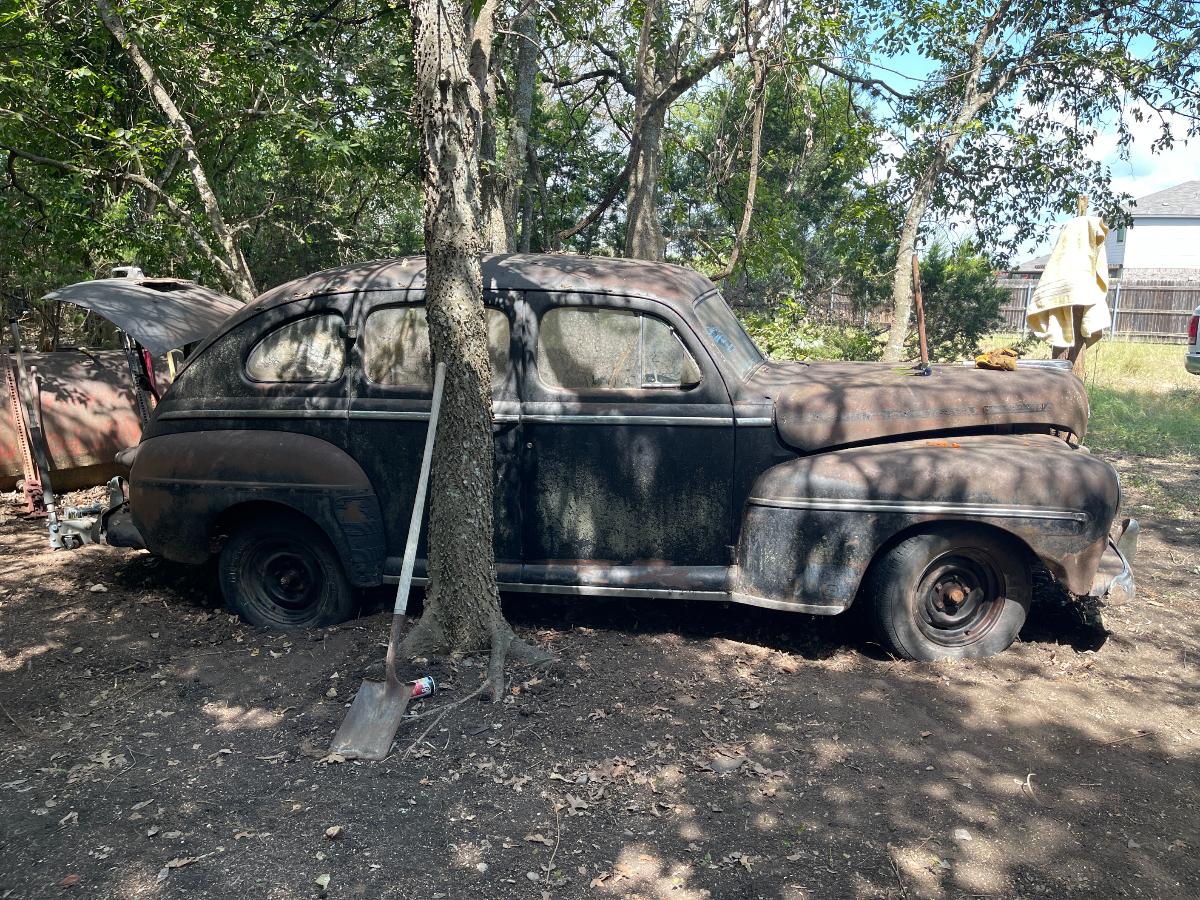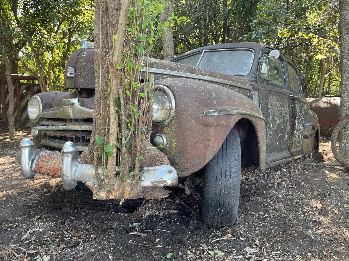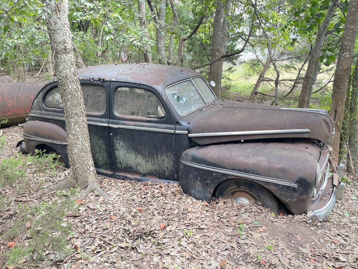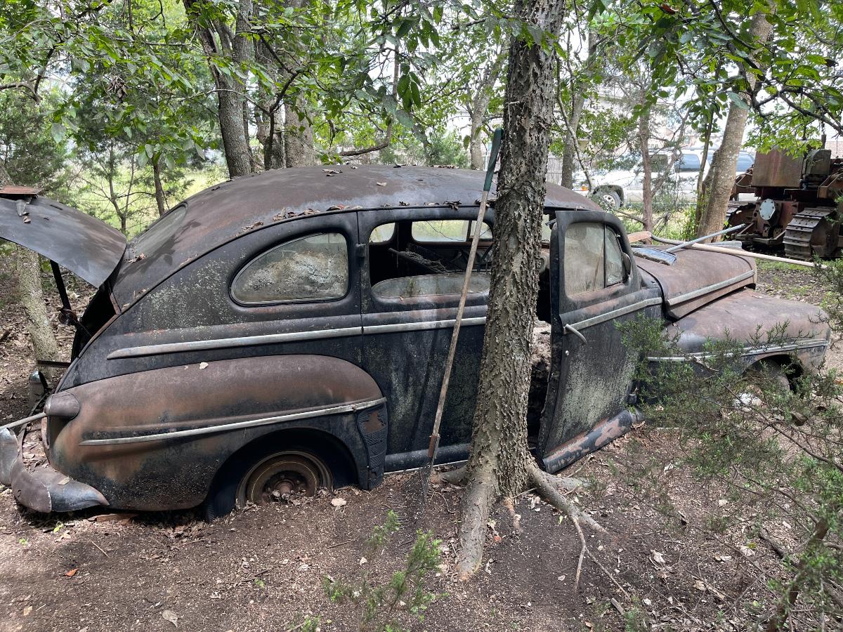 So, there we were, at 10,000' AGL with only one parachute between the two of us..... Oh wait! Sorry...that's another story.... So, there we were with the right wheel refusing to come up out of the ground. Well, there were hundreds of little viney, rooty things entangled in the front suspension...none of it of enough consequence to really hang things up THAT much. So we (meaning, I) dug some more and uncovered a root as big around as a man's...um...thumb that had grown through one of the narrow gaps in the steel wheel. My buddy Bill took the easy side, the lucky sod! Digging out around the outside of a wheel wasn't so bad. It was INSIDE the wheel that was the real bugaboo. The car was jacked up and blocked up so there was no real danger but it was a very close, very tight space to have to work in. Having to do it over again, I would have gotten my reciprocating saw and made a slice right down into the dirt and call it a win but at that point my muses had fled the scene altogether and I was left to my own devices, armed only with stubbornness (and a shovel) to get me through. Once that root was finally cut, lifting the front of the car became a simple mathematical equation and off came the old wheels and on went the roller wheels. I will admit, they do look highly questionable but every one of them has a tube inside and that, making them round and capable of holding air, is really the only point of roller wheels. We were able to jack the car up high enough that it paid to pack the dirt back in below the tires before setting it back down now much higher and happier. The process was repeated on the rear end in far less time, we being wiser about what to expect from early buggy-style suspensions with transverse leaf springs and our also being...root-less. (Is that a word?) Suddenly we had a car that was ON the ground, rather than IN it. By this time, the car had fought us harder than the M37 ever did if you take into account all the cutting and digging. Would it roll? Could we squeak it out from between the trees? After hooking up tow-chains, cables and a sheave in order to guide the car out of the tree corral to a place of safety, Dirty Gertie got involved once again and with her motivating the poor, sad thing it moved. It ACTUALLY moved! Yes, for the first time in SIXTY YEARS, the '47 Ford Super Deluxe made its way out of the woods and into the bright Texas sunlight....dragging its dirty little feet all the way. Finally, it was out of what would otherwise have been its grave. The wheels would not roll, or break free and roll and it was at this point, the car got its name. NAILS. As in, 'as tough as nails'....because the car certainly wasn't cutting us a single break. Plus, Nails is a heckuva lot easier than saying Forty Seven Ford Super Deluxe which is a mouthful in any language. Wheels that don't turn just aren't practical. You guessed it. More to come! Cheers, TJ