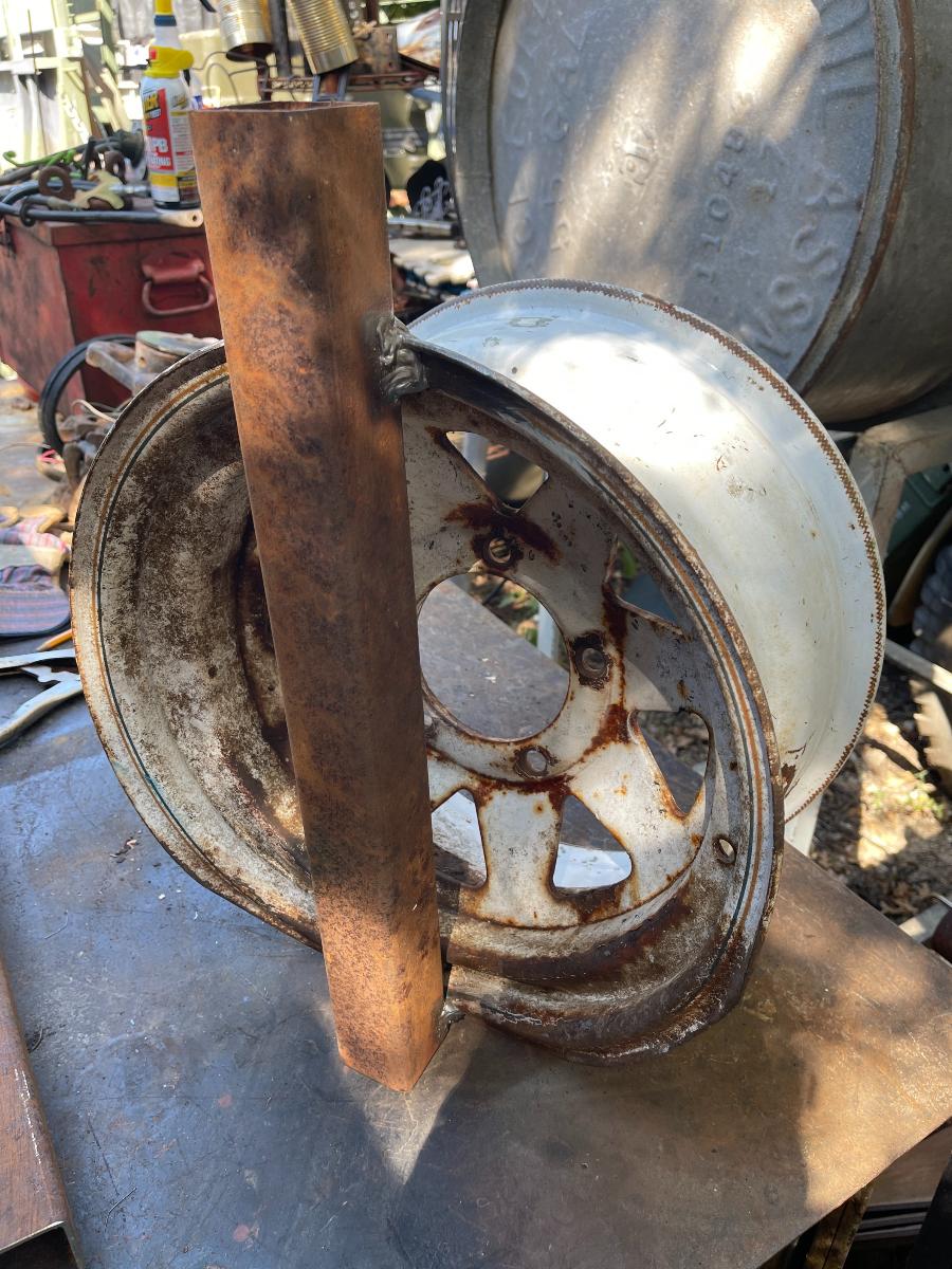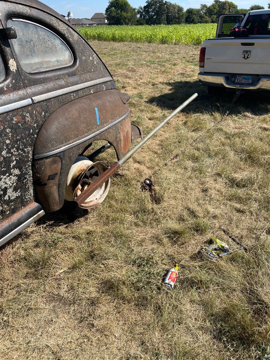 Meanwhile, back at the ranch... Nails hadn't magically renewed herself in any way, shape, or form. No matter how long I've been doing this and no matter how much experience I have had doing this I simply cannot return to a project like this and not expect that somehow, SOME WAY, something will be different when I return... Never happens. Nope. So when we came back to it, we were armed to the teeth with my latest genius invention which is based upon a badly damaged Ford bolt pattern rim, size 2X, WIDE. The chief difference in the freeing-the-wheels process between Nails and the M37 is that Nails has those ridiculous, in-your-face, cartoon-balloon fenders which almost preclude any notion of breaking the drums free of the brakes using my earlier method. Almost. With a 2" x 2" section of square steel tubing welded across the breadth of the wheel, we now had a pocket into which a long section of heavy gauge pipe could be inserted. If you study the picture you will see that the rim is badly bent in on one side. Why that is 'good' in this case is, anything placed in the square tubing extends outward at an angle, providing clearance for the fenders which is doubly important up front where any leverage applied makes the steering want to go hard over to one side or the other. I postulated that two fat guys applying their weight to the end of said longish pipe would, thereby, be exerting enough force that the rust bond would surely be broken and all would be well once again. I am told Archimedes said something about having a lever and moving the world. So far as I know, he did NOT say one single thing about the quality of the lever. Ours just bent. Que the long, sad trombone! Womp-Womp-Womp-Wommmmmmmp. I can tell you this. I commented upon the quality of OUR lever. I surely did....and it is not repeatable here. But, in the plus column, we already had proof of concept, having achieved good results with the M37, albeit in a vastly overpowering fashion, while hooked to big Budd rims that are nearly indestructible. And, we had my lovely new wheel tool thingy. The fact is, we just didn't know how to use it yet. So, we pulled the darned thing off and ran back over to my place for Plan B and I fabricated a new method of putting horsepower, rather than manpower, to the wheel. I used the same pipe but far shorter, with a cast off shackle from the M37 welded to the end. This would be inserted into one end of the square tubing. Since the pipe was obviously willing to bend if it was working alone, I took a long section of jack hammer bit, welded on another shackle and inserted it into the other end of the square tubing and into the pipe. Now, we had a really serious piece of metal in there which, if it did not work out, could be removed for Plan C....whatever that might be. For just a moment, consider all the work we are doing for this cr*ppy old car. Now imagine what I would be willing to do for something that was actually worthwhile! The following day, we returned to Nails with New-&-Improved in hand. This time I had done my homework. Courtesy of the internet, I figured how to bring the toe adjusters for the brakes up and into a neutral position. The heel adjusters had been underground and under water for 60 years and I didn't bother with them. We hooked the trucks up with chains. One truck to anchor and the other to pull. I had a feeling Gertie might murder this old car, so I left her at home. Annnnnd, the first pull bent the pipe again. Well, isn't that wonderful! But that's not what I REALLY said. So, we bailed out, went back to my place and cut that black pipe down to REAL short. Now there was nothing really sticking out of the square tubing TO bend. We returned and bolted everything back up and gave her a B---h Slap. Nothing. What th....! Now, I suppose some of you know what a B---h Slap is....and THAT wasn't working. So we gave it a FLYING B---h Slap because if Nails wasn't going to behave like a lady, we sure weren't going to treat her like one. BINGO! The wheel turned. We removed the pullers and inserted another long pipe and this time, two fat guys DID move it. We worked it back and forth and it became clear that the lower half of the drum was where the real problem was (not surprising since it was below ground) whereas the upper half was pretty clear. We repeated the process on all four wheels and one FLYING B---h Slap after another got it done. I must admit, I really hadn't envisioned us getting this far. NOW what do we do? Stay tuned! Cheers, TJ