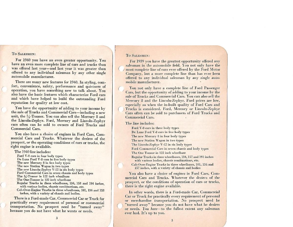 Below is a scan of the Ford Reference Manual page 3 (typically called the salesman's handbook ) for both 1939 and 1940. Neither book has any reference to a "Standard", on any page of either book. If, as you believe, Ford referenced, for sales, Ford V-8 Cars as Standards in 1939 I do not see it. Typically the sales and the parts departments are in the same building at a dealership. To have the Salesmen and the parts dealers reference the identical line of car with two different names could lead to the name Standard being accepted. I do agree that it appears Ford wanted their 1940 low priced car named "Ford V-8 Cars" and would want that description in any aspect of sales including advertisement.